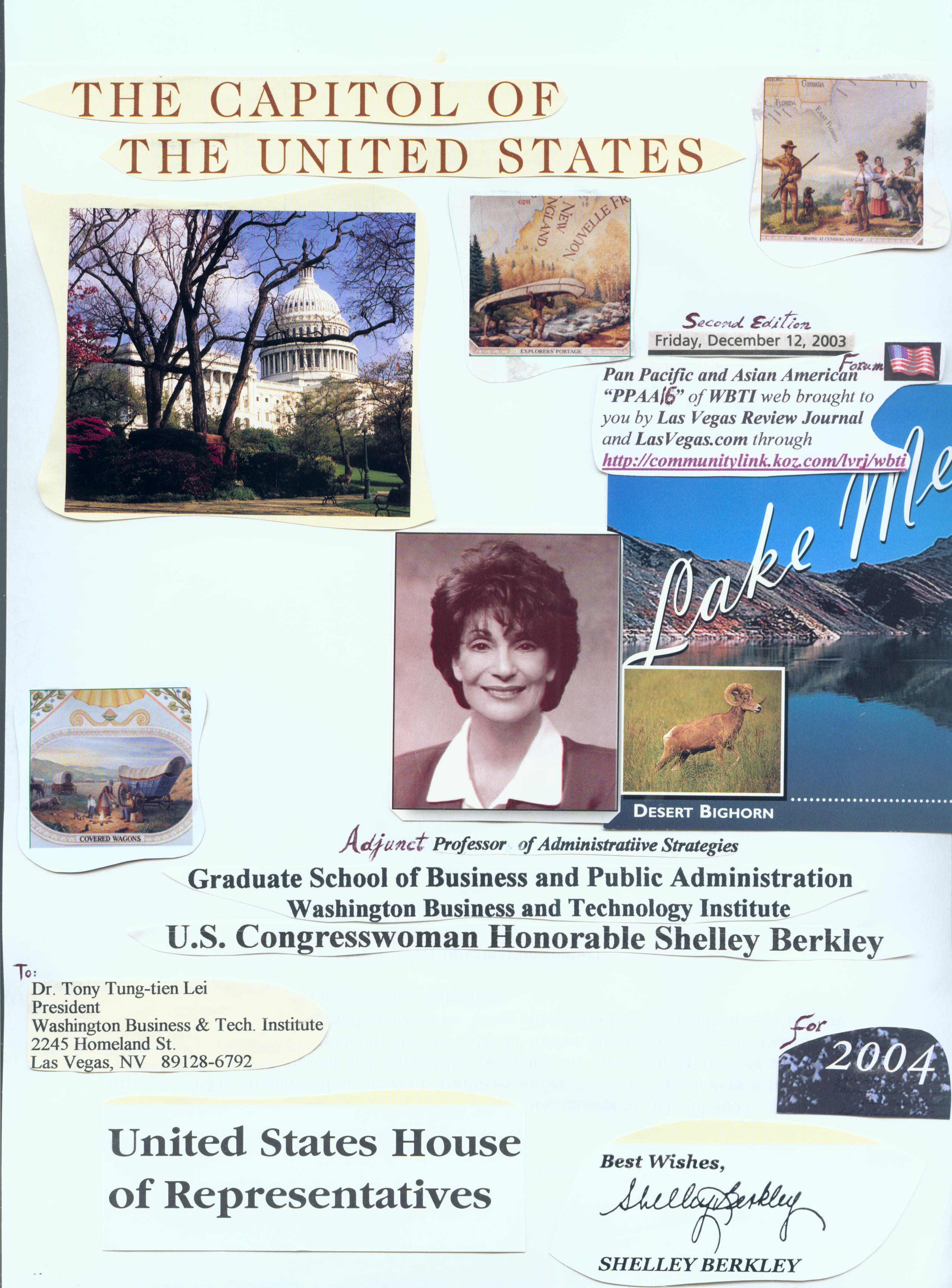 Newsbrief ***** Friday, January 2, 2004 ***** # First Edition Washington Business and Technology Institute (WBTI) http://communitylink.reviewjournal.com/lvrj/wbtiAdvisory Board: Governor Kenny Guinn, Chairman; U. S. Senators Harry Reid and John Ensign, Vice Chairmen; U. S. Representatives James Gibbons and Shelley Berkley, and Las Vegas Mayor Oscar Goodman, Executive Directors. U. S. Secretary of Labor Elaine Chao Chairperson Dr. Tony T. Lei President District Judges Mark R. Denton and Valorie J. Vega Vice Presidents Dr. William N. Thompson Director of Public Administration Institution Dr. E. Lee Bernick and Dr. G. Keong Leong Deans of Graduate School of Business and Public Administration Dr. Sue Fawn Chung Director of Culture Institution Justice of the Supreme Court William Maupin, Attorney General Brian Sandoval, and District Judge Stewart Bell, Honorary Chairmen of Clark County District Attorney and Police Civil Commission (CCDAPCC) District Attorney David Roger and Clark County Sheriff Bill Young Chairmen of CCDAPCC (702) 255-9058 ------------------------------------------------------------------------------------------------- Some introduction about Dr. Tony Lei By Jessie Walsh and Cheryl Moss Dear Manager Sandra, In response to your request for an introduction of Dr. Tony Lei to the voters and homeowners of South Shores Community Association, Dr. Lok had U.S. Congresswoman Shelley Berkley the following paragraphs for her to introduce Tony from our Institution in the Event and Dinner Party for a Special Tribute to U. S. Senator Harry Reid.*1 ********************** Dr. Tony Lei is the President of Washington Business and Technology Institute (WBTI) and Chairman of Chinese American Academic Association of Nevada (CAAAN). He received his M.B.A. and Doctor of Education in Institutional Management degrees from Pepperdine University in 1969 and 1980, respectively. He had been an Associate Professor of Information Management of the Graduate School of Business Administration of National Chunghsing University and a Fallow of Management of Pepperdine University from 1985 to 1991 and 1991 to 1996, respectively. He has completed numerious scientific papers, text books, best selling books, and research projects during past 30 years in universities and academic institutes. Dr. Lei's dedication and performance in academic research are indicated by the acceptance of his papers continuously for presentation and publication by the International Conference on Technology and Education (ICTE), International Information Management Congress (IIMC), and Science Engineering Technology Seminars (SETS). His famous publications of "Modern Business Management," "Information Management," "Management Behavior," "The Art of Leading," among others have been adopted by many universities and colleges as textbooks. During his three year term from 1997 to 2000 as a Director of the Las Vegas Senior Citizens Advisory Board, he had enhanced its social and educational value of the activities and programs of the Board. As the Exective Vice President of Seniors United in 2000, he modernized its management with non-partisan and educational advancement for our Nevadan seniors. As Director of the Board of South Shores Community Association (SSCA) since 1993, Dr. Tony Lei's knowledge, wisdom, and talent have contributed to the SSCA's being one of the best community in the United States of America for many years. He is now the Senior Advisor of U. S. Congresswoman Shelley Berkley; Clark County Assistant District Attorney Office; Raleigh, Hunt, McGarry & Drizin, P.C.; and Constable's Office, Las Vegas Township. Dr. Tony Lei has published 82 books on business management, marketing, and information magement. He has also published more than 276 papers on business administration, information management, and computer education. Many of them were presented by him to famous international conferences in business, information, and educational management. A paper entitled "The Impact of Appropriate Use of Computer Learning on Mathematics Scores," was published by the 11th International Conference on Technology and Education (ICET) in 1993 at London, England. He presented a paper entitled "Enhancing Mathematics Learning with Computers," at the 12th ICTE in Orlando, Florida.*2 At the same time, he was the first presider of the conference on educational multimedia and computing in the 15th Florida Educational Technology Conference (FETC) in Orlando, Florida. In 1996, he presented and published "A Study of the Implementation of Computer Education in Public Schools" at the 13th ICTE in New Orleans, Louisiana. In January 2000, Dr. Tony Lei and Dr. William Thompson established the Public Administration Institution (PAI) for WBTI. It has Dr. Thompson as its Fellow and Director; and Nevada State Senator and Professor of UNLV Dina Titus, Justice of the Supreme Court Nancy Becker, Former Attorney General Frankie Sue Del Papa, District Judges Mark Denton, Valorie Vega, Michelle Leavitt, Jennifer Togliatti, Jessie Walsh, and Dr. Achie Chang as its Fellows. Dr. Tony Lei is also the Honorary President of Great Wall College and Xaimen Straits Foreign Language College. He is the Contrbuting Editor of "Nevada Examiner." He has creatively led WBTI as an non-profit organization dedicated to the encouragement and promotion of academic research, community service, and humane spirit for all of our residents and visitors of Nevada. On March 11, 2003, Dr. John Wang, Spokesman of WBTI, announced the appointment of Dr. E. Lee Bernick and Dr. G. Keong Leong as deans of WBTI's Public Administratioon Division and Business Administration Division of the Graduate School of Business and Public Administration (GSBPA) of Washington Business and Technology Institute (WBTI)*3 Faculty members of the Graduate School include Drs. Harry Reid, Shelley Berkley, and Dina Titus as Professors of Administrative Strategies; District Judges Mark Denton, Valorie Vega, and Nancy Saitta as A