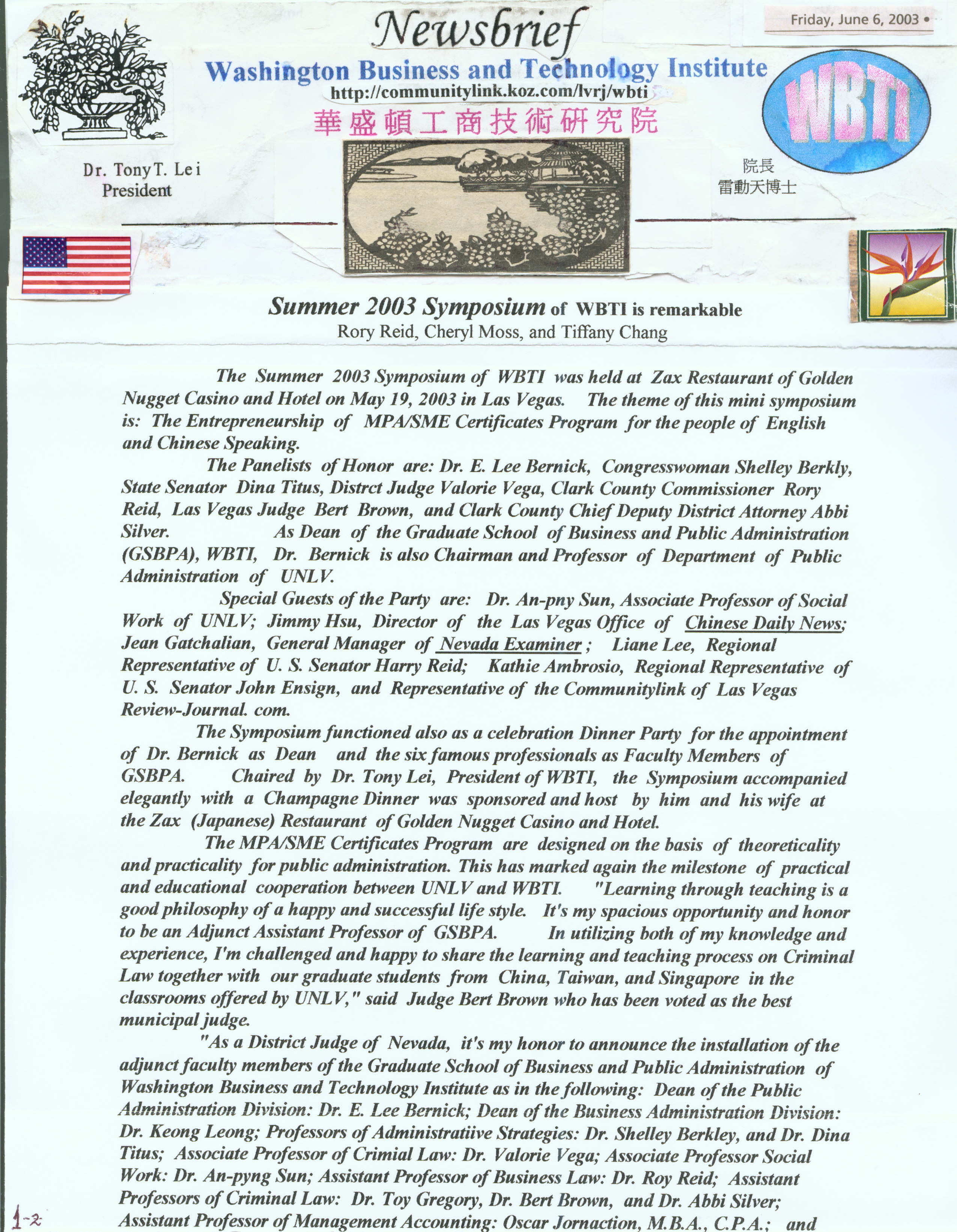 Shelley Berkley, Lorranine Hunt, Oscar Goodman win the honor as Chairpersons of Nevada Expo Mission to China By Cheryl Moss, Becky Ung, and Tiffany ChangU. S. Congresswoman Shelley Berkley has put her ground of leadership on the efficiency and balance of good work performance and human relations. She has been Executive Advisor for Washinton Business andTechnology Institute(WBTI) since1996. At the time when Shelley was elected as the Member of International Relations committee (IRC) of the U. S. Congress, she told Las Vegas Review-Journal that to promote the tourism, trade, and investment with foriegn countries for Nevada and our States is her primary interest. Dr. Lei has been honored byChina Business Chain, Inc. (CBCI), Shangshai People's Municipal Goverment Cooperation Office (SPMGCO), and China State Development and Planning Commission as Chairman of Nevada Expo Mission to China to attend the Annual International Mayors for City Development Forum, Shangshai International Industrial Fair, and Yangtze Investment Project Expo 2003. Dr. Tony Lei, President of WBTI, is organizing a sound team joined by many high-ranking officials both of Nevada and California. U. S. Congresswoman Shelley Berkley, Nevada Lt. Governor Lorranine Hunt, and Las Vegas City Mayor Oscar Goodman have been honored by WBTI, CBCI, and SPMGCO as Honoray Chairpersons of our Nevada Expo Mission to China. Clark County Commissioner Rory Reid; Las Vegas City Councilmen Larry Brown and Lawrence Weekly have been invited as its Special Guests. 77777777777777777777777777777777777777777777777777777777777777777777777777777888888888888888888888888888888888888888888888888888888888888888888888888888888 | | | | | | | Go To Page: [1][2][3][4][5][6][7][8][9][10][11][12][13][14][15][16][17][18][19][20][21][22][23][24][25][26][27][28][29][30][31][32][33][34][35][36][37][38] 39 [40][41][42][43][44][45][46][47][48][49][50][51][52][53][54][55][56] | |