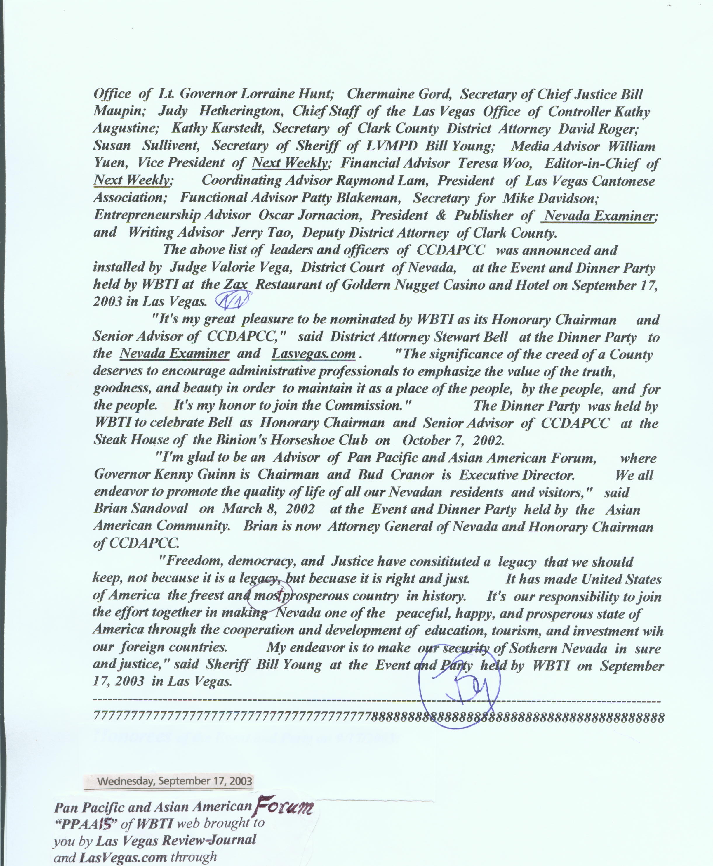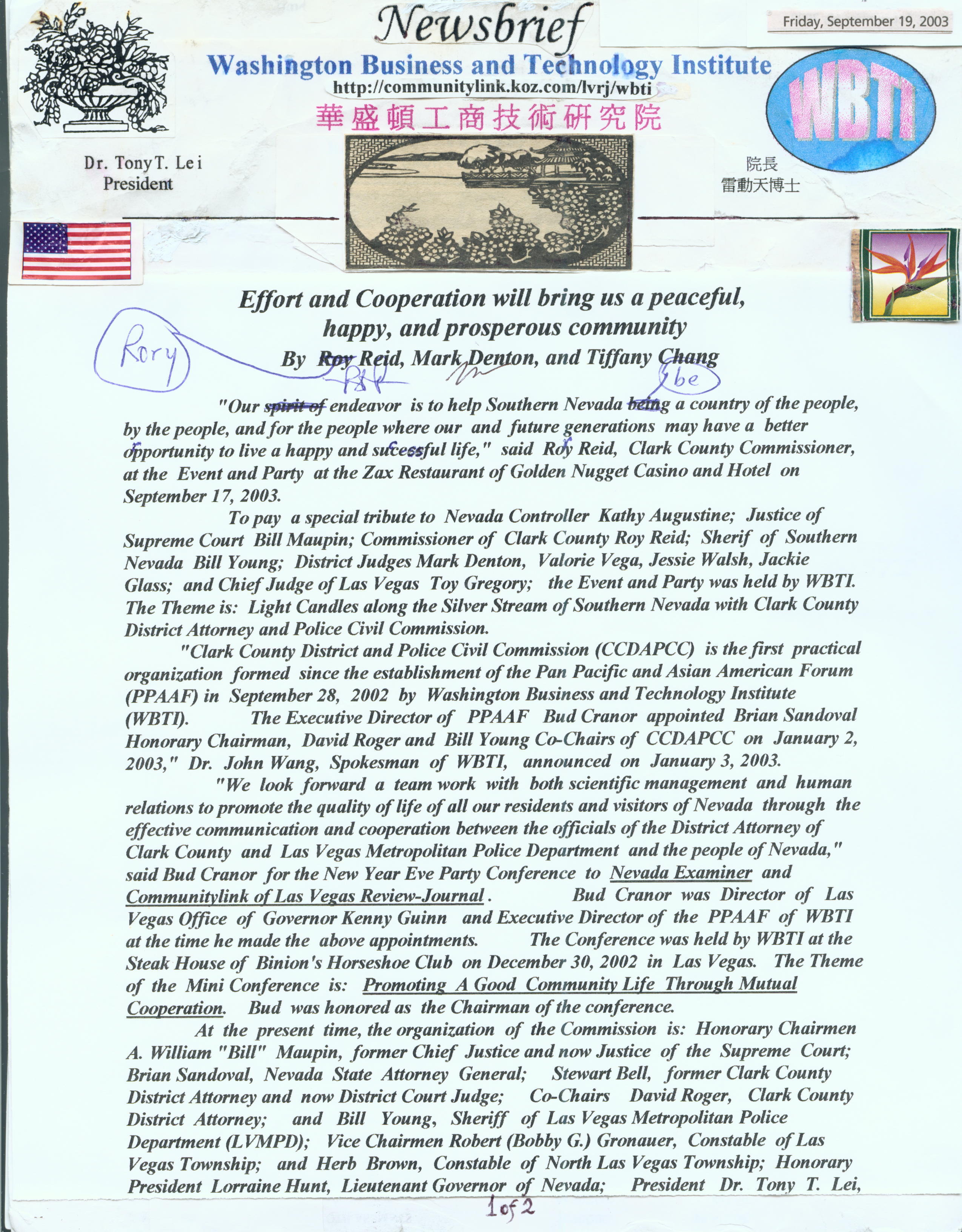 Newsbrief September 25, 2003 Washington Business and Technology Institute ------------------------------------------------------------------------------------------------------------------Effort and cooperation will bring us a peaceful, happy, and prosperous community By Rory Reid, Mark Denton, and Tiffany Chang "Our endeavor is to help Southern Nevada be a country of the people, by the people, and for the people where our and future generations may have a better opportunity to live a happy and succeeful life," said Roy Reid, Clark County Commissioner, at the Event and Party at the Zax Restaurant of Golden Nugget Casino and Hotel on September 17, 2003. To pay a special tribute to Nevada Controller Kathy Augustine; Justice of Supreme Court Bill Maupin; Commissioner of Clark County Roy Reid; Sherif of Southern Nevada Bill Young; District Judges Mark Denton, Valorie Vega, Jessie Walsh, Jackie Glass; and Chief Judge of Las Vegas Toy Gregory; the Event and Party was held by WBTI. The Theme is: Light Candles along the Silver Stream of Southern Nevada with Clark County District Attorney and Police Civil Commission. "Clark County District and Police Civil Commission (CCDAPCC) is the first practical organization formed since the establishment of the Pan Pacific and Asian American Forum (PPAAF) in September 28, 2002 by Washington Business and Technology Institute (WBTI). The Executive Director of PPAAF Bud Cranor appointed Brian Sandoval Honorary Chairman, David Roger and Bill Young Co-Chairs of CCDAPCC on January 2, 2003," Dr. John Wang, Spokesman of WBTI, announced on January 3, 2003. "We look forward a team work with both scientific management and human relations to promote the quality of life of all our residents and visitors of Nevada through the effective communication and cooperation between the officials of the District Attorney of Clark County and Las Vegas Metropolitan Police Department and the people of Nevada," said Bud Cranor for the New Year Eve Party Conference to Nevada Examiner and Communitylink of Las Vegas Review-Journal . Bud Cranor was Director of Las Vegas Office of Governor Kenny Guinn and Executive Director of the PPAAF of WBTI at the time he made the above appointments. The Conference was held by WBTI at the Steak House of Binion's Horseshoe Club on December 30, 2002 in Las Vegas. The Theme of the Mini Conference is: Promoting A Good Community Life Through Mutual Cooperation. Bud was honored as the Chairman of the conference. At the present time, the organization of the Commission is: Honorary Chairmen A. William "Bill" Maupin, former Chief Justice and now Justice of the Supreme Court; Brian Sandoval, Nevada State Attorney General; Stewart Bell, former Clark County District Attorney and now District Court Judge; Co-Chairs David Roger, Clark County District Attorney; and Bill Young, Sheriff of Las Vegas Metropolitan Police 1-2 Department (LVMPD); Vice Chairmen Robert (Bobby G.) Gronauer, Constable of Las Vegas Township; and Herb Brown, Constable of North Las Vegas Township; Honorary President Lorraine Hunt, Lieutenant Governor of Nevada; President Dr. Tony T. Lei, President of WBTI; Vice President Kathy Augustine, State Controller of Nevada; Secretary General Cheryl Moss, District Judge of Family Court; Senior Advisor Stewart Bell, District Court Judge; Founding Advisor Mike Davidson, Former Assitant District Attorney of Clark County; Promoting Advisors Rennie Schreiber, Chief Staff of the Office of Lt. Governor Lorraine Hunt; Chermaine Gord, Secretary of Chief Justice Bill Maupin; Judy Hetherington, Chief Staff of the Las Vegas Office of Nevada Controller Kathy Augustine; Kathy Karstedt, Secretary of Clark County District Attorney David Roger; Susan Sullivent, Secretary of Sheriff of LVMPD Bill Young; Media Advisor William Yuen, Vice President of Next Weekly; Financial Advisor Teresa Woo, Editor-in-Chief of Next Weekly; Coordinating Advisor Raymond Lam, President of Las Vegas Cantonese Association; Functional Advisor Patty Blakeman, Secretary for Mike Davidson; Entrepreneurship Advisor Oscar Jornacion, President & Publisher of Nevada Examiner; Writing Advisor Jerry Tao, Deputy District Attorney of Clark County; and Secretary Agnas Chan. The above list of leaders and officers of CCDAPCC was announced and installed by Judge Valorie Vega, District Court of Nevada, at the Event and Dinner Party held by WBTI at the Zax Restaurant of Goldern Nugget Casino and Hotel on September 17, 2003 in Las Vegas. "It's my great pleasure to be nominated by WBTI as its Honorary Chairman and Senior Advisor of CCDAPCC," said District Attorney Stewart Bell at the Dinner Party to the Nevada Examiner and Lasvegas.com . "The significance of the creed of a County deserves to encourage administrative professionals to emphasize the value of the truth, goodness, and beauty in order to maintain it as a place of the people, by the people, and for the people. It's my honor to join the Commission." The Dinner Party was held by WBTI to celebrate Bell as Honorary Chairman and Senior Advisor of CCDAPCC at the Steak House of the Binion's Horseshoe Club on October 7, 2002. "I'm glad to be an Advisor of Pan Pacific and Asian American Forum, where Governor Kenny Guinn is Chairman and Bud Cranor is Executive Director. We all endeavor to promote the quality of life of all our Nevadan residents and visitors," said Brian Sandoval on March 8, 2002 at the Event and Dinner Party held by the Asian American Community. Brian is now Attorney General of Nevada and Honorary Chairman of CCDAPCC. "Freedom, democracy, and Justice have consitituted a legacy that we should keep, not because it is a legacy, but becuase it is right and just. It has made United States of America the freest and most prosperous country in history. It's our responsibility to join the effort together in making Nevada one of the peaceful, happy, and prosperous state of America through the cooperation and development of education, tourism, and investment wi