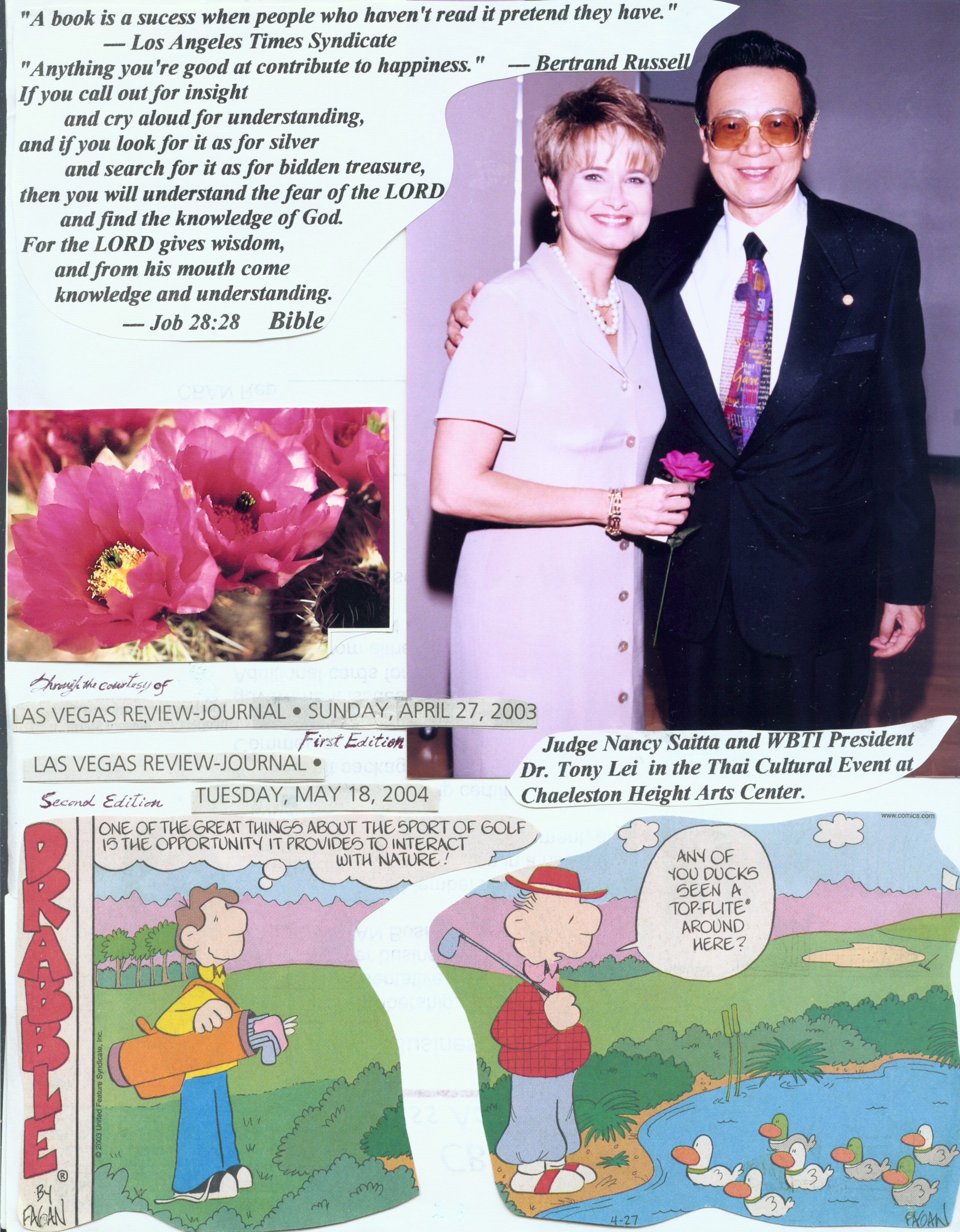 Public Services ***** Saturday, May 1, 2004 ***** #Second Edition Washington Business and Technology Institute (WBTI) http://communitylink.reviewjournal.com/lvrj/wbtiAdvisory Board: Governor Kenny Guinn, Chairman; U. S. Senators Harry Reid and John Ensign, Vice Chairmen; U. S. Representatives James Gibbons and Shelley Berkley, and Las Vegas Mayor Oscar Goodman, Executive Directors. U. S. Secretary of Labor Elaine Chao Chairperson Dr. Tony T. Lei President District Judges Mark Denton and Valorie Vega Vice Presidents Dr. William N. Thompson Director of Public Administration Institution Dr. E. Lee Bernick and Dr. G. Keong Leong Deans of Graduate School of Business and Public Administration Dr. Sue Fawn Chung Director of Culture Institution Justice of the Supreme Court William Maupin, Attorney General Brian Sandoval, and District Judge Stewart Bell, Honorary Chairmen of Clark County District Attorney and Police Civil Commission (CCDAPCC) District Attorney David Roger and Clark County Sheriff Bill Young Chairmen of CCDAPCC (702) 255-9058 *It's our pleasure to pay a tribute to the above officials who dedicate to the civic and community service spects of our organization in an honorary or adjunct capacity. ------------------------------ Knowledge, experience, and professionalism with wisdom By GSBPA of WBTI*1 The modern and creative philosophy of management is advanced on the following words of wisdom, among others:*2 ***"The trees that are slow to grow bear the best fruit." --- Moliere ***"Luck is a matter of preparation meeting opportunity." --- Oprah Winfrey ***"The secret of joy in work is contain in one word -- excellence. to know how to do something well is to enjoy it." --- Pearl Buck ***"Plans fail for lack of counsel, but with many advisers they succeed." --- Proverbs 15 : 22 "Bible" "As a bridge between the business and university, the integrity of community service and academic research of Washington Business and Technology Institute (WBTI) will help Nevada go advance for the cooperation and development in education, business, and culture among international countries. As an Adjunct Associate Professor of the Graduate School of Business and Public Administration (GSBPA) of WBTI, it's my pleasure to extend my knowledge, experience, and professionalism in public service for community and education at the adjunct capacity," said Jackie Glass, District Judge of Nevada, at the event and dinner party by Unity Council of Nevada in Lindo Michoacan Mexican Restaurant on April 28, 2004 in Las Vegas.*3 ----------------------- References *1. GSBPA of WBTI is the initials of Graduate School of Businness and Public Administration of Washington Business and Technology Institute (WBTI). *2. Chang, Tiffany. 'Some good personal traits for an individual to be successful in business and some golden words of wisdom for positive thinking,' "Newsbrief of WBTI," (April 8, 2004), Las Vegas, Nevada: WBTI. *3. Glass, Jackie. "A writing paragraph with signature on my appointment by Washington Business and Technology Institute," (April 28, 2004), Las Vegas, Nevada: WBTI. 333333333333333 888888888888888888888888888888888 777777777777777777777777777777777777777777777 ************************************************ | |