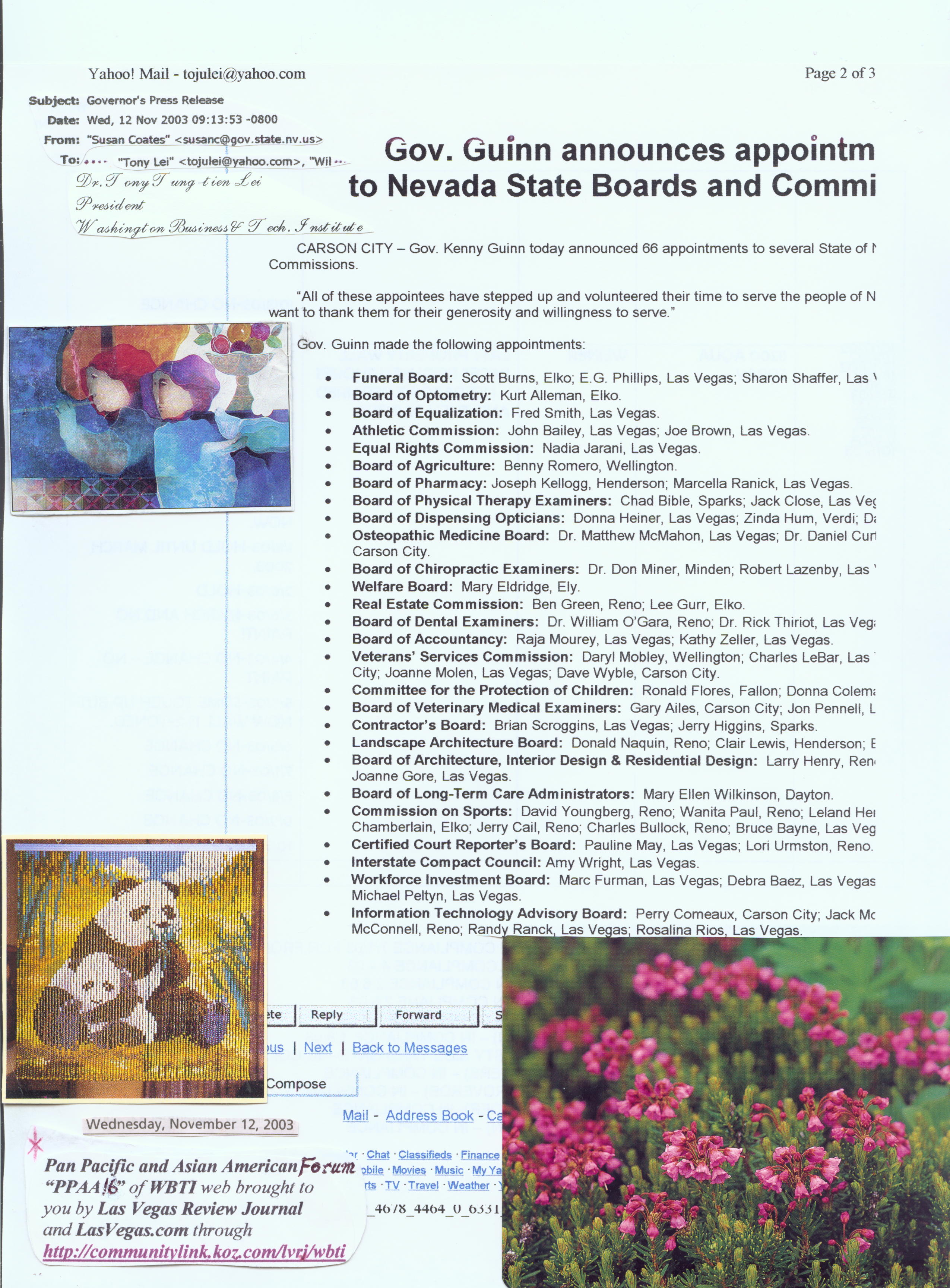 Newsbrief ***** November 17, 2003 # First Edition Washington Business and Technology Institute http://communitylink.reviewjournal.com/lvrj/wbtiAdvisory Board: Governor Kenny Guinn, Chairman; U. S. Senators Harry Reid and John Ensign, Vice Chairmen; U. S. Representatives James Gibbons and Shelley Berkley, and Las Vegas Mayor Oscar Goodman, Executive Directors. U. S. Secretary of Labor Elaine Chao Chairperson Dr. Tony T. Lei President Dr. William N. Thompson Director of Public Administration Institution Dr. E. Lee Bernick and Dr. G. Keong Leong Deans of Graduaute School of Business and Public Administration Dr. Sue Fawn Chung Director of Culture Institution Justice of the Supreme Court William Maupin, Atorney General Brian Sandoval, and District Judge Stewart Bell, Honorary Chairmen of Clark County District Attorney and Police Civil Commission (CCDAPCC) District Attorney David Roger and Sheriff William Young Chairmen of CCDAPCC (702) 255-9058 -------------------------------------------------------------------------------------------------- Resume the booming tourism for our Silver State through educational , economic, and cultural cooperation and development with foreign countries By Rory Reid, Cheryl Moss, and Tiffany Chang "The Executive Meeting of Clark County District Attorney and Police Civil Commission (CCDPACC) of Washington Business and Technology Institute (WBTI) was held at the Zax Restaurant of Golden Nugget Casino and Hotel in Las Vegas on July 9, 2003. As Secretary General of this Commission, I'm challenged to have good work performance on its creed to better the quality of life of all our residents and visitors of Nevada," said Cheryl Moss, Distrct Judge of Family Court of Nevada. We are endeavoring to resume the booming tourism for our Silver State through educational, economic, and cultural cooperation and development with foreign countries after the 911 and SARS. Under the supports from the administrative, juridical, and legislative authorities of this State, Deans of Graduate School of Business and Public Administration Dr. E. Lee Bernick and Dr. G. Keong Leong, Director of Public Administration Institution Dr. William N. Thompson, and Director of Culture Institution Dr. Sue Fawn Chung together with all the faculty members of WBTI will have a good potentiality to advance the contribution to our people of this Silver State.*1 In meeting with the large and growing population of public employees, Washington Business and Technology Institute (WBTI) will open its training and graduate programs for the increasing graduate study and research needs of employees, executives, administrators, and owners of the private and public companies, Institutions, and organizations. to emphasize the balance of the practicality and theoraticality of the programs, the Graduate School of Business and Public Administration (GSBPA) of WBTI has supported by many high-ranking officials of Nevada in offering thier times, experiences, and knowledge to teach.*2 The MPA/SME Certificate Program are designed on the basis of theoreticality and practicality for public administration. This has marked again the milestone of practical and educational cooperation between UNLV and WBTI. Learning through teaching is a good philosophy of a happy and successful life style. It's my precious opportunity and honor to be an Adjunct Assistant Professor of GSBPA. In utilizing both of my knowledge and experience, I'm challenged and happy to share the learning and teaching process on Criminal Law together with our graduate students from China, Taiwan, and Singapore in the classrooms offered by UNLV," said Judge Bert Brown who has been voted as the best municipal judge.*3 " As a District Judge of Nevada, it's my honor to announce the installation of the adjunct faculty members of the Graduate School of Business and Public Administration (GSBPA) of Washington Business and Technology Institute (WBTI) as the following: Dean of the Public Administration Division: Dr. E. Lee Bernick;Dean of the Business Administration Division; Dr. Keong Leong; Professor of Administrative Strategies: Dr. Shelley Berkley and Dr. Dina Titus; Associate Professor of Criminal Law: Dr. Valorie Vega; Associate Professor Social Work: Dr. An-pyng Sun; Assistant Professor of Business Law: Dr. Rory Reid; Assistant Professors of Criminal Law: Dr. Toy Gregory, Dr. Bert Brown, and Dr. Abbi Silver; Assistant Professor of Management Accounting: Oscar Jornacion, M. B. A., C. P. A; and Honorary Director of Chinese Publicity: Jimmy Hsu," District Judge Valorie Vega announced during the Symposium held by WBTI on May 19, 2003 in Las Vegas. "It's really a challenge to me to integret my knowledge and experience for teaching. I'll have this precious opportunity to extend my effort for community service through my prfessionalism. I'm honor also to be the number 35,000 viewer of WBTI website which is brought to you by reviewjournal.com through http://communitylink.kozcom/lvrj/wbti," said District Judge of Nevada Mark Denton at the time when he acknowleged his appointment as an Adjunct Associate Professor of GSBPA of WBTI. "The mission of this School will emphasize the humanitarian orientation of public administration and the social responsibility of business management. Through academic entrepreneurship, we may expect the endeavor of this School for the community service based on humane spirit, led by Chairperson Elaine Chao of WBTI," said Dr. Dina Titus, Professor of Administrative Strategies in GSBPA.*4 The Summer 2003 Symposium of WBTI was held at Zax Restaurant of Golden Nugget Casino and Hotel on May 19, 2003 in Las Vegas. The theme of this mini symposium is: The Entrepreneurship of MPA/SME Certificates Program for the people of English and Chinese Speaking. "To encourage the cooperation and development of English and Chinese speaking countries with Nevada has been particularly important to our country at this critical period of time. The establishment of GSBPA will 