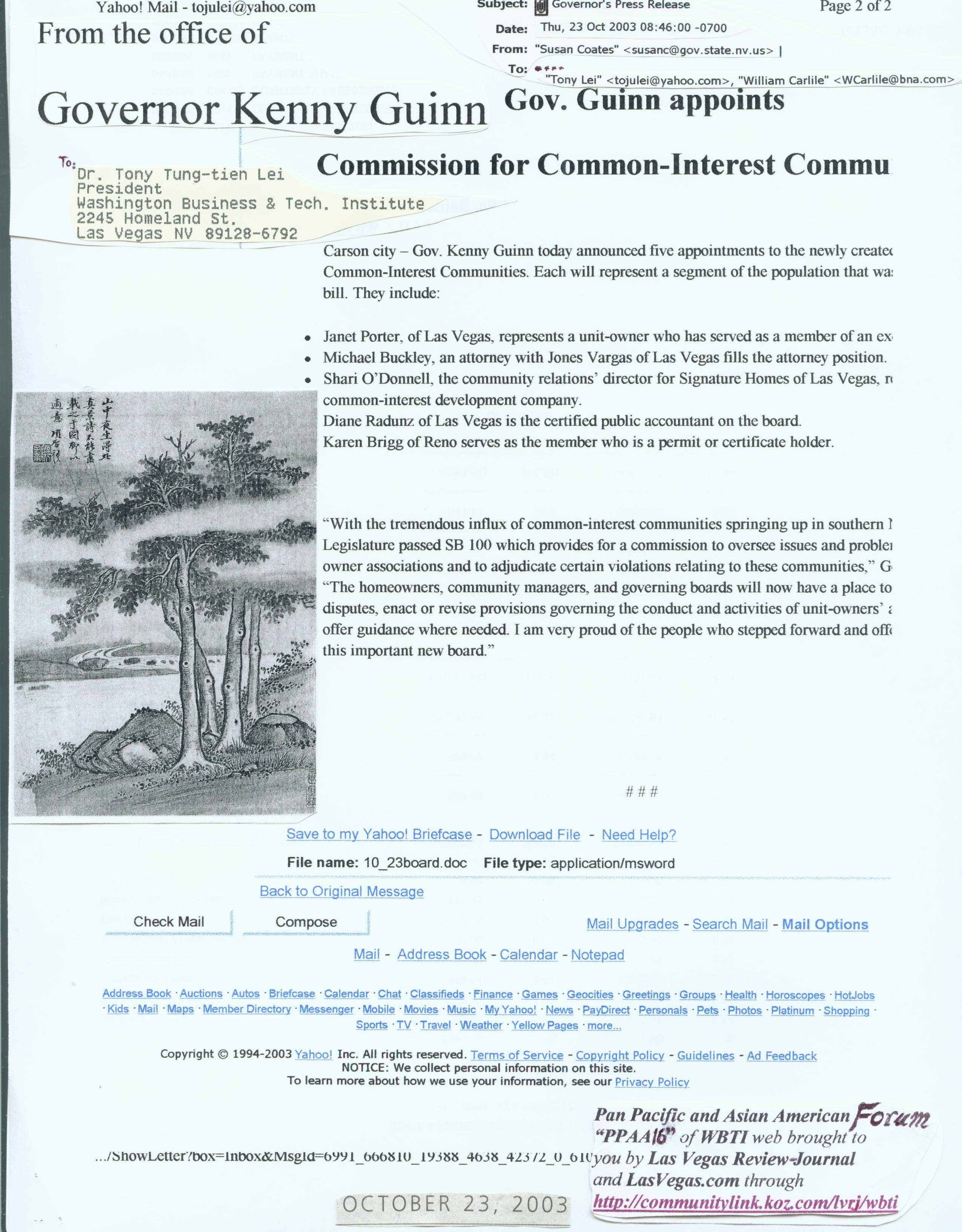 Newsbrief ***** October 21, 2003 # 2nd Edition Washington Business and Technology Institute http://communitylink.reviewjournal.com/lvrj/wbtiAdvisory Board: Governor Kenny Guinn, Chairman; U. S. Senators Harry Reid and John Ensign, Vice Chairmen; U. S. Representatives James Gibbons and Shelley Berkley, and Las Vegas Mayor Oscar Goodman, Executive Advisors. Dr. Tony T. Lei (702) 255-9058 ------------------------------------------------------------------------------------------------------------ Welcome to Event and Dinner Party held by the Asian American Group By Cheryl Moss and Tiffany Chang Date: Wednesday October 22, 2003 ***** Time: 7:00 p.m. - 9:30 p.m. Location: Harbor Palace Restaurant, China Town, Las Vegas It planned to invite Donald Kwalick, M. D., Chief Public Health Officer as the Kenote Speaker and District Judge Mark Denton, Judges Stephen George, Dawn Haviland, and Natalie Tyrrell, and District (Family) Court Judge Bill Voy as Guests of Honor. Assemblywoman Kathy McClain, Las Vegas Councilwoman Lynnette Boggs- McDonald, Speaker of the Nevada House and Deputy Chief of the Henderson Police Department Richard Perkins, and Clark County Commissioner Myrna Williams were scheduled to be invited as Special Guests (Speakers). It also planned to invite University Regent Stavros Anthony, Disrict Judges Michael Douglas and Jackie Glass, Judges Karen Bennett-Haron, District (Family) Court Judges Robert Lueck and Cheryl Moss, District Judge Nancy Saitta, Judge Doug Smith, and Nevada Assemblywoman Valerie Weber as Special Friends of the Asian American Event. Event Chairpersons will be:David Amesbury, Esq., Raj Chanderraj, M. D., Benson Lee, Esq., and Steve Wolfson, Esq. It planned to have Event Hosts: Kamal Asnani, Dolly DeLeon, Romeo Jurani, Steve Kwon, R.D. Prabhu, M. D., L. Kristopher Rath, Esq., and Mike Vaswani. The Event and Dinner Party was organized by Peter Lok, O. M. D. Of the organization, the Master/Misttress of Ceremony are: Frank Banaria, Dolly DeLeon, Pia Galapon, and Rita Vaswani; while the Event Coordinators are: Supatra Chemprachum, Jimmy Hsu, Bettina Ho, David Lee, Ph. D., Tony Lei, Ed. D., Lillian Morizono, Ngoc Nguyen, Ben Torres, and Erol Turer. All of the guests will have about 250 people. The above information was written according to the latest update fax to Dr. Tony Lei from Dr. Peter Lok on the evening of October 21, 2003. Guests invited by Dr. Tony Lei, Chairman of Chinese American Academic Association of Nevada and his wife Judy are: Agnas Chan, Dr. Sonny Ho, Jessica Huang, Cathy Lee, Philip Lin, Edward Lu, Jane Neil, Robert Song, Teresa Woo, and Iris Zhang. 777777777777777777777777777777777777777777 7777777777777777777777777777777777777777777777777777777 777777777777777777777777777777777777777777777777777777777777777 | |