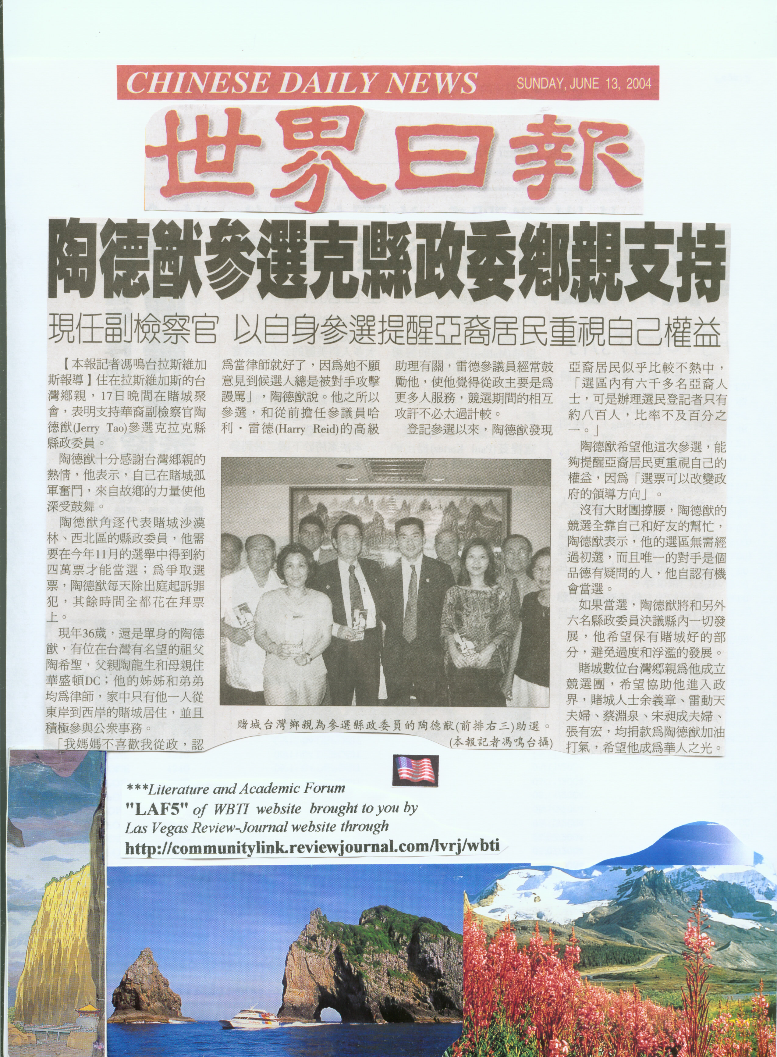 070204 ---Dr. Tony Lei, the Member of Select Host Committee of Jerry Tao for Clark County Commissioner, in the party held at the Amlee Chinese Cuisine on June 17, 2004 in Las Vegas. The following picture shown from left to right were: Jong Yiee, Robert Tsai, Judy Lei, Robert Borboa, Dr. Tony Lei, Jerry Tao, Michael Chang, Gloria Wong, Robert Song, and Alice Song: |