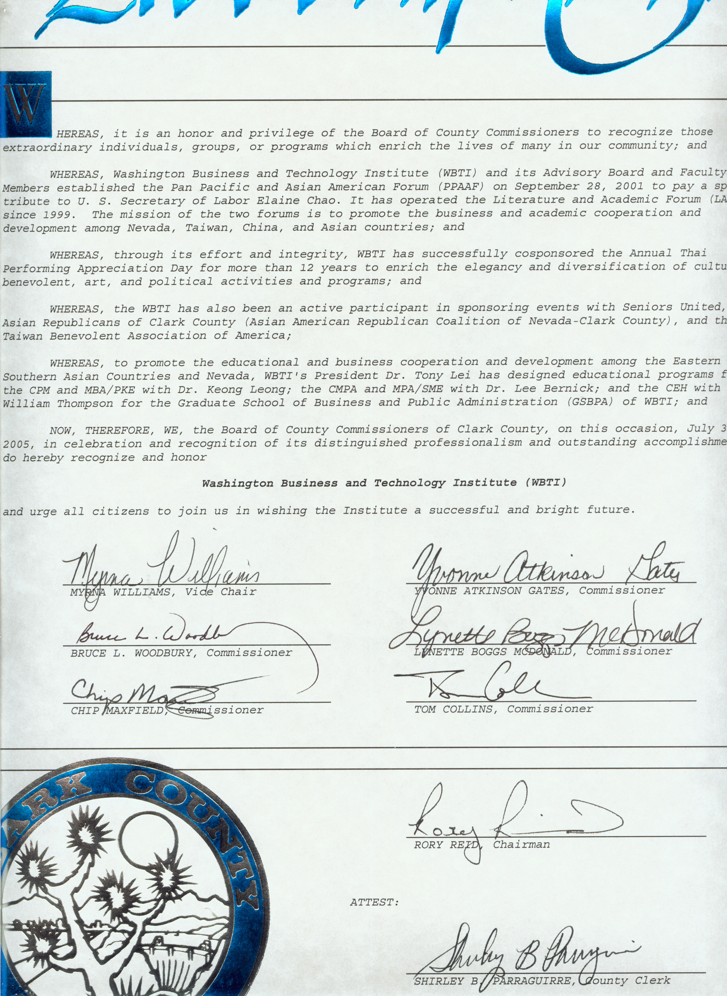 Dr. Lei's extraordinary commitment and dedication to Southern Nevada is beyond compare, and is reflected by his participation in numerous educational, political, collegial and business entities. He has given generously of his time and talents to help make Clark County, Nevada a better place to live.