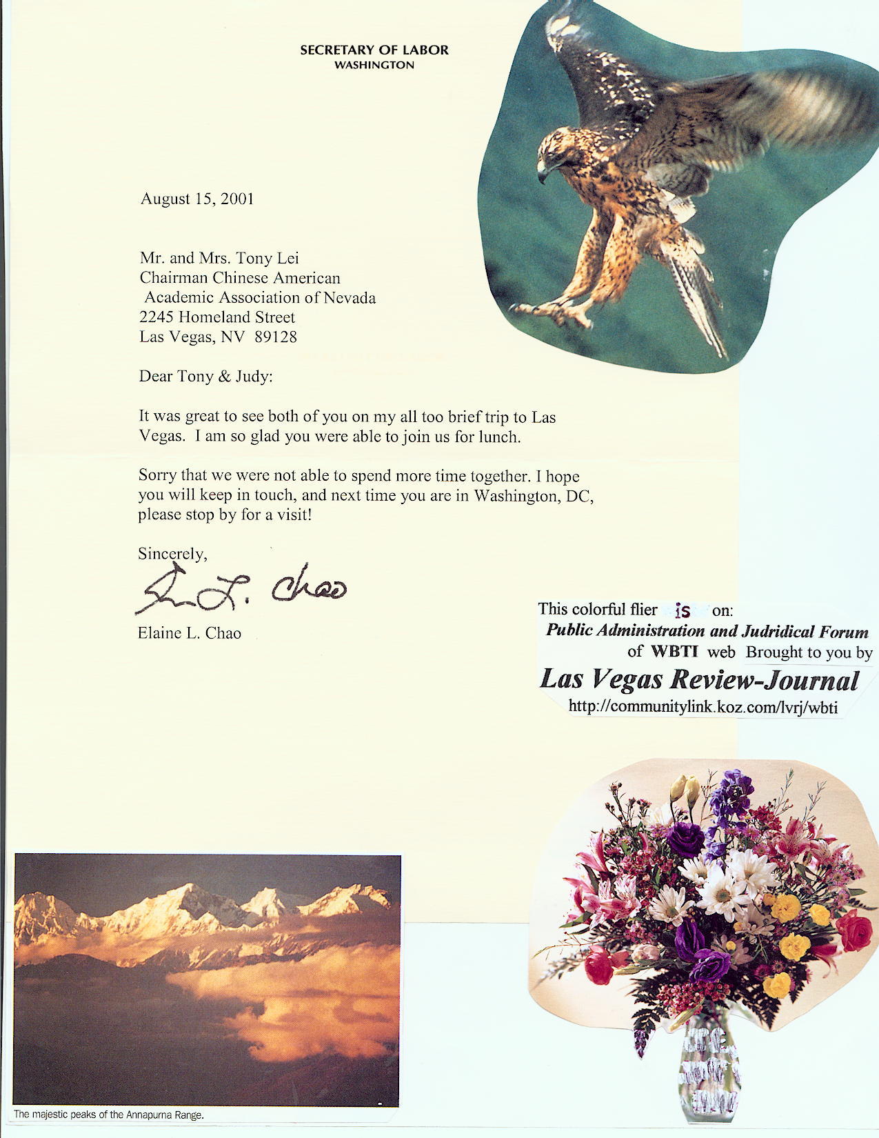 (from Google.com)062707-1237 "Elaine Chao, U. S. Secretary of Labor" of WBTI website, Wednesday, 12:37 p.m., June 27, 2007 #First Edition Washington Business and Technology Institute (WBTI)http://communitylink.reviewjournal.com/lvrj/wbti Advisory Board: Governor Jim Gibbons, Chairman; U. S. Senators Harry Reid and John Ensign, Vice Chairmen; U. S. Representatives Shelley Berkley and Las Vegas Mayor Oscar Goodman, Executive Directors. U. S. Secretary of Labor Elaine Chao, Chairperson; Dr. Tony T. Lei, President. District Judges Mark Denton and Valorie Vega, Vice Presidents. Dr. William N. Thompson, Director of Public Administration Institution; Dr. E. Lee Bernick and Dr. G. Keong Leong, Deans of Graduate School of Business and Public Administration; Dr.Sue Fawn Chung, Director of Culture Institution; Dr. John Z. Wang, Acting Director of Asian Marketing Institution. U. S. District Court Judge Brain Sandoval, Chief Justice of the Supreme Court William Maupin, District Judge Stewart Bell, Honorary Chairmen, Clark County District Attorney and Police Civil Commission (CCDAPCC). District Attorney David Roger and former Clark County Sheriff Bill Young, Chairmen of CCDAPCC. *It's our pleasure to pay a tribute to the above officials who dedicate to the civic and community service aspects of our organiza-tion in an honorary or adjunct capacity. WBTI's e-mail address: tojulei@yahoo.com U. S. Secretary of Labor Elaine Chao and important individuals in Nevada! The leading key words on Google, Yahoo, Search, MSN, AOL, Ask, Altavista, WebCrawler, and Infoseek! by Jennifer Kung From now on, any definition of a successful life must include serving others! --George Bush*1 ____________________________________________ ***** "The heights by great men/women reached and kept were not attained by sudden flight, but they, while their companions slept, were toiling upward in the night." --Henry Wadsworth Longfellow Brilliant! Important individuals in Nevada with the name by U. S. Secretary of Labor Elaine Chao have been the leading key words on Google, Yahoo, Search, MSN, AOL, Ask, Altavista, WebCrawler, and Infoseek! The following are some examples which have been just shown by the above leading search engines on the Internet at 8:57 a.m. on June 27, 2007: For "u s secretary of labor elaine chao and senator john ensign": Search Results 1 - 10 of about 961 for u s secretary of labor elaine chao and senator john ensign - 0.30 sec. Washington Business and Technology Institute - Elaine Chao, U.S. ... [ An event photo of U. S. Secretary of Labor Elaine L. Chao (DOL photo/Shawn ... elaine chao", "u s senator john ensign", "ms elaine chao", "Elaine Chao was ...communitylink.reviewjournal.com/servlet/...&START_COUNT=4 - 87k - Cached - More from this site Washington Business and Technology Institute - John Ensign, U. S. Senator U. S. Secretary of Labor Elaine Chao, Chairperson; Dr. Tony T. Lei, President. ... A bill authored by U. S. Senators John Ensign and Harry Reid has signed ...communitylink.reviewjournal.com/servlet/...&START_COUNT=3 - 84k - Cached - More from this site For "u s secretary of labor elaine chao and nevada governor jim gibbons": Washington Business and Technology Institute - Business ... Jim Gibbons is Governor of Nevada starting from January 1, 2007. ... U. S. Secretary of Labor Elaine Chao and her Department's "In Focus Update" on June 8, 2007 ...communitylink.reviewjournal.com/servlet/lvrj_ProcServ/dbpage=cge&... - 114k - Cached Washington Business and Technology Institute - Bill Maupin, Chief ... ... of 'Jim Gibbons, Governor of Nevada' on the Yahoo.com," (April 14, 2007), U. ... inspired by U. S. Secretary of Labor Elaine Chao, Washington Business and ...communitylink.reviewjournal.com/servlet/...&START_COUNT=1 - 78k - Cached Washington Business and Technology Institute - Jim Gibbons, Governor of ... ... have a friend in Jim Gibbons and look forward to electing him Governor of Nevada. ... The establishment's candidate was then-Secretary of State Cheryl Lau. ...communitylink.reviewjournal.com/servlet/...&START_COUNT=3 - 148k - Cached - More from this site For "u s secretary of labor elaine chao and u s senate majority leader harry reid": Washington Business and Technology Institute - Harry Reid, U. S. Senator (U. S.) Senate Majority Leader Harry Reid of Nevada announced Wednesday he is ... the Asian American Leaders Tea with United States Senator Harry Reid on May 31, ...communitylink.reviewjournal.com/servlet/lvrj_ProcServ/dbpage=page&... - 129k - Cached - More from this site Washington Business and Technology Institute - Kenny Guinn, Former ... ... U. S. President George Bush, U. S. Secretary of Labor Elaine Chao, California ... and their leaders from Dr. Tony Lei for U. S. Senator Honorable Harry Reid to ...communitylink.reviewjournal.com/servlet/...&START_COUNT=4 - 72k - Cached WBTI's articles for U. S. Secretary of Labor Elaine L. Chao in this section and the section of "Business and Administration" have been shown on the Internet by leading search engines soon after they were published. The following is an example: Washington Business and Technology Institute - Elaine Chao, U.S. ... U. S. Secretary of Labor Elaine L. Chao's article in Chinese for "Happy Mother's Day" is on Internet! ... of Labor Elaine L. Chao for "Happy Mother's Day! ...communitylink.reviewjournal.com/servlet/lvrj_ProcServ/dbpage=page&... - 86k - Cached - More from this site Washington Business and Technology Institute - Jim Gibbons, Governor of ... ... Gibbons attended the Pioneer Day Pancake Breakfast and the Pioneer Days Parade. ... Ground Crew campaign team wish everyone a Happy Independence Day! ...communitylink.reviewjournal.com/servlet/...&START_COUNT=3 - 148k - Cached - More from this site The most recent "U. S. Department of Labor In Focus Update" was received by WBTI. Its main parts are posted as in the following: The following is a summary of the latest news release. *3 U.S. Department of Labor recovers nearly $1.