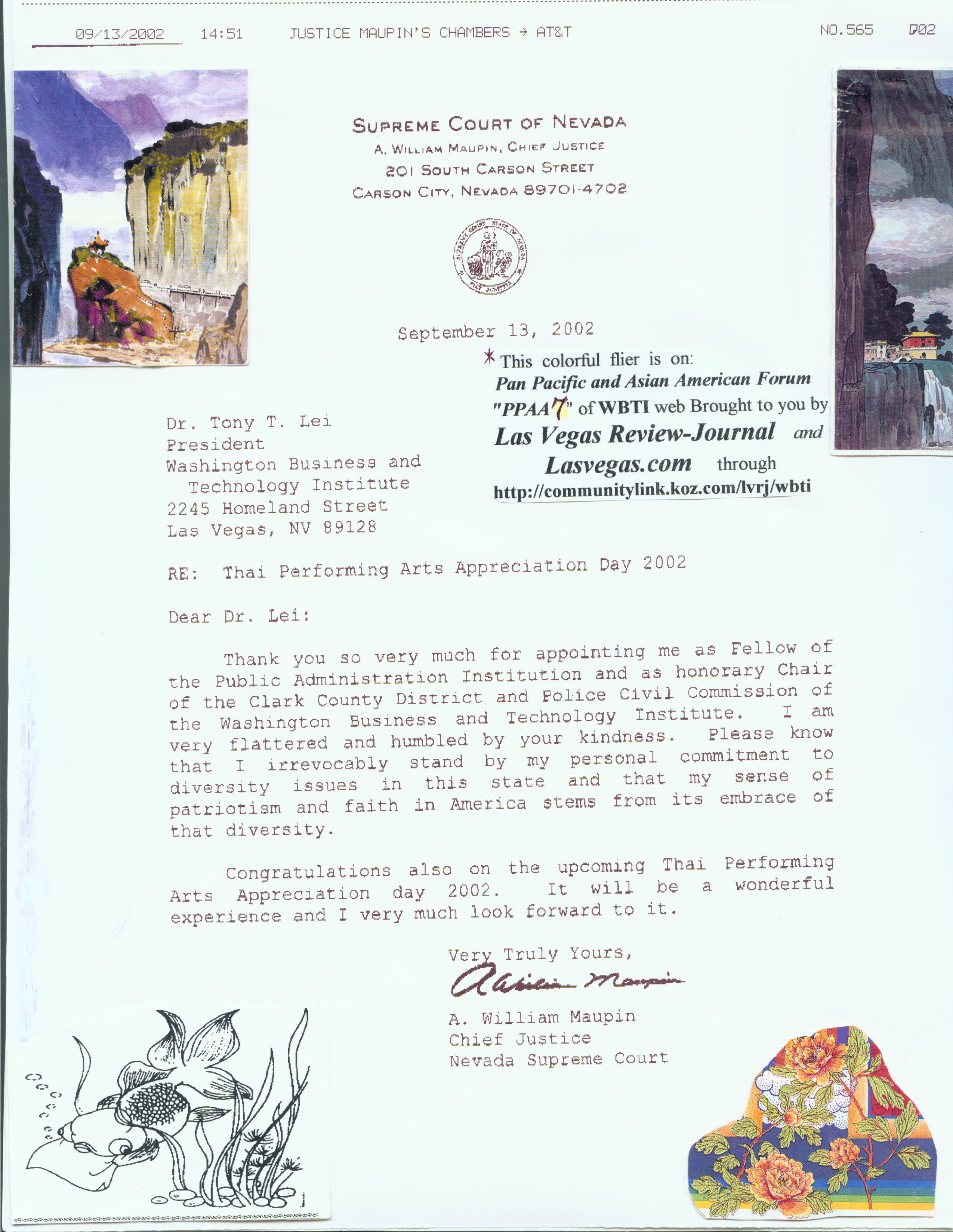 (010311-2237)III. Wish President Dr. Tony Tung-tien Lei a great future and success! by Michael Douglas, Jessie Walsh, and Cheryl Moss ... ..... .......--President Dr. Andrew K. Benton *107 <<<<< ***** SUPREME COURT OF NEVADA *1 Michael L. Douglas, Justice 316 Bridger Avenue Las Vegas, Nevada 89101 (702) 486-3225 ***** April 22, 2005 Dr. Tony T. Lei, Ed. D. 2245 Homeland St. Las Vegas, Nevada 89128 Asian American Republican Coalition of Nevada Clark County Chapter Las Vegas, Nevada Dear Friends: It gives me great pleasure to extend my greetings as you gather for the first installation of the Board of Directors and Executive Officers of AARCN-CC sponsored by AARCN-CC and co-sponsored by WBTI. I commend and applaud your commitment and ongoing efforts to achieve the goal of political, social, economic and educational equality. Thank you for the difference you make in Nevada and the Greater Las Vegas community. I am sorry I will miss being a part of your special occasion. Please accept my very best wishes for a successful and memorable evening. Sincerely, Michael L. Douglas, Justice Supreme Court of Nevada PS: Dr. Lei and Dr. Jasmine Brooks, you are both doing great things for Nevada and the Asian Nevada community. MLD:llm *1. The hard copy of the Certificate of Recognition to Asian American Republican Coalition of Nevada is shown on the section of "Photos & Pictures" (04/25/2005) at http://communitylink.reviewjournal.com/lvrj/wbti >>>>> *75007 [[[[[ By the act of love itself, we are enriched. Love in action is service above self. Make service a part of our character and experience the abundant reward that comes from serving others. Let our candles fuel a fire of service that will fan out in ever- increasing circles. With these circles, together we can close our eyes and envision a community that is safe, peaceful, and healthy. District ( Family ) Court Judge Cheryl Moss said that she has remained dedicated to helping the community, and she has been inspired by Dr. Lei's leadership, wisdom, and guidance for her service. The Judge has recognized that Tony's accomplishments have demonstrated that taking part in the community with his unselfish kindness for service can make an excellence for our society. ]]]]] *3017 ---------------------------------------- ********************************************* (010311-2117) May all the joy and wonder of this holiday season remain with you always! Best regards, Dr. Liz Kent Dr. Tricia Devin --------------------------------------- ******************************************** 010311-2037 Nevada Governor Brian Sandoval took his oath of office, noting his eternal optimism. ~{!0~}I take my oath proudly optimistic. My optimism is rooted in the spirit of Nevada,~{!1~} Mr. Sandoval said in his inaugural speech. ***** Advisory Board of LVRJ/wbti: Governor Brian Sandoval, Chairman; U. S. Senators Harry Reid and John Ensign, Vice Chairmen; U. S. Representatives Shelley Berkley and Las Vegas Mayor Oscar Goodman, Executive Directors. 24th U. S. Secretary of Labor Elaine Chao, Chairperson; Dr. Tony T. Lei, President. District Judges Mark Denton and Valorie Vega, Vice Presidents. ... ..... ....... ---------------------------------------- ******************************************** | |