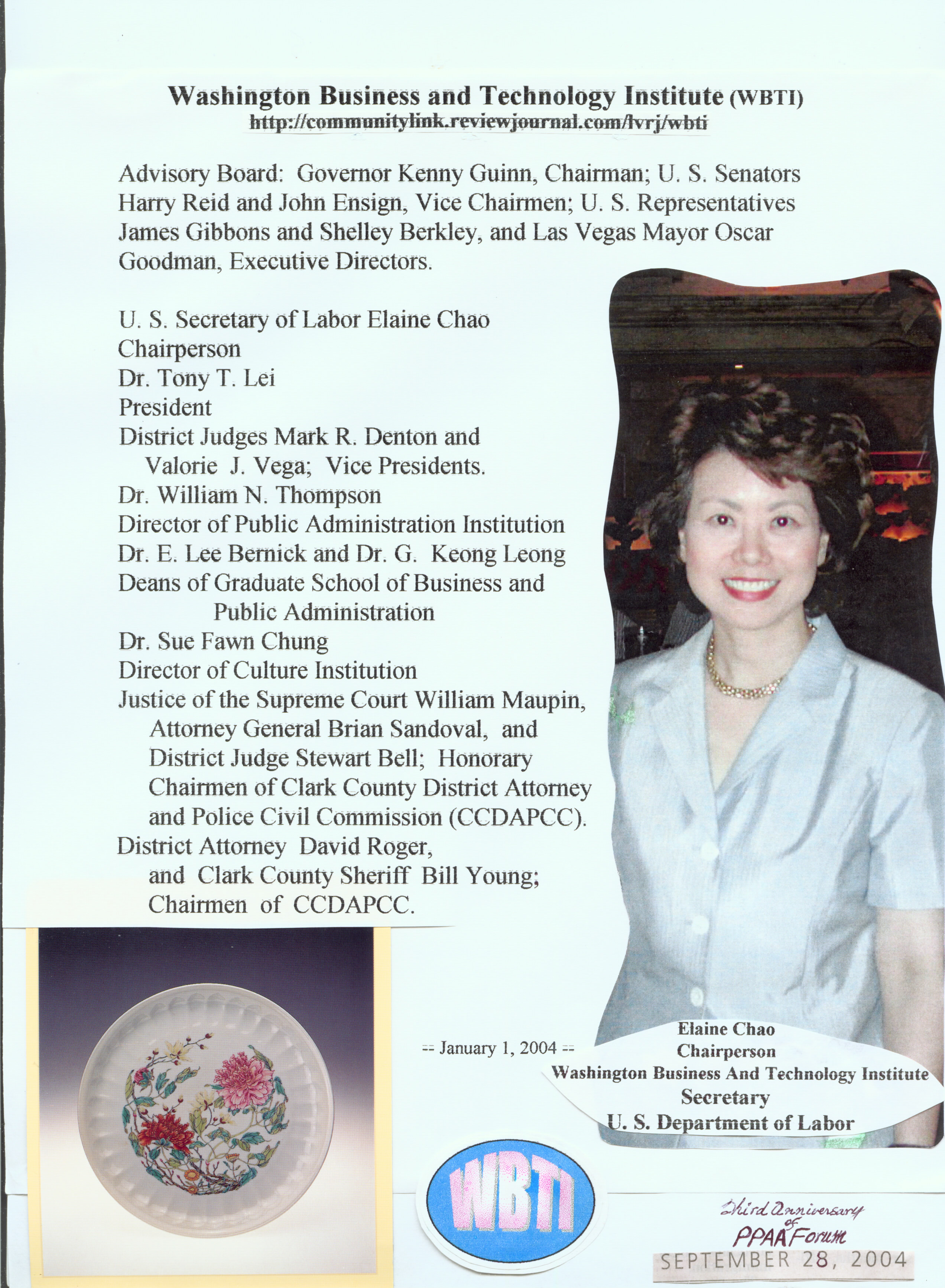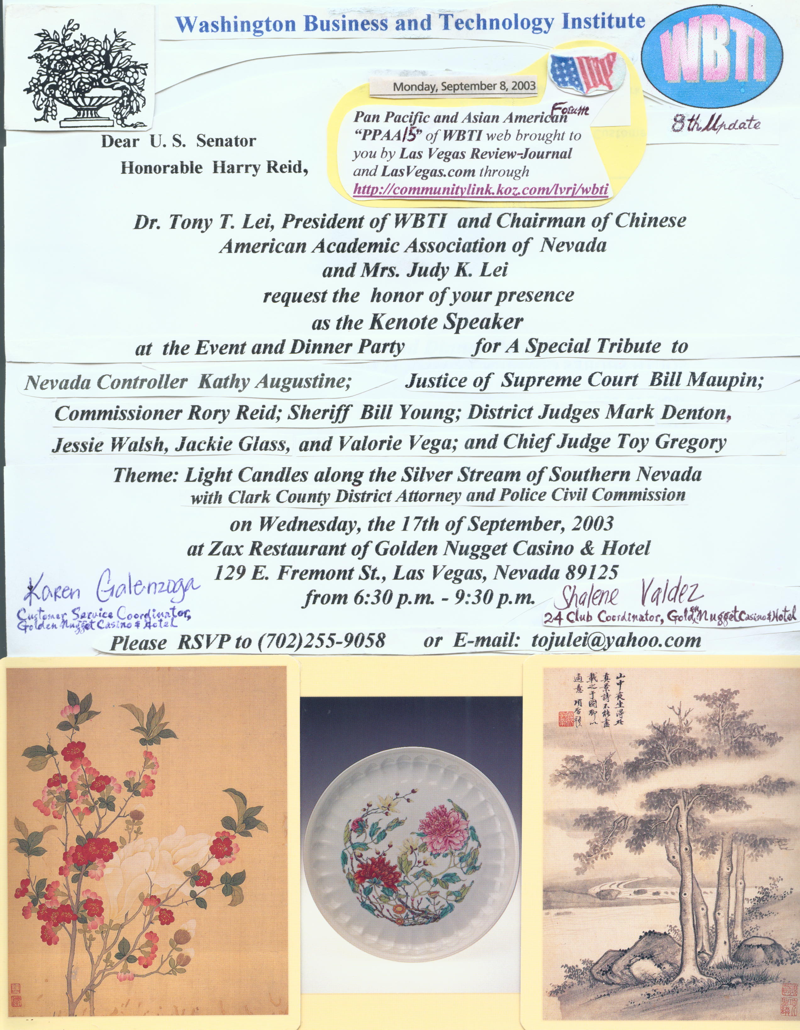 A Welcome Party and Preliminary 28th Board Directors and Advisors Meeting were held on July 29, 2005 at the Paris Hotel in Las Vegas, Nevada. To pay a special tribute to his great contribution to the 28th Convention and TBAA, Dr. Tony Tung-tien Lei has been nominated by Chairperson Wendy Wu of TBAA as an Advisor of Taiwan Benevolent Association of America. The nomination was seconded and unanimously voted by all the presented Directors and Advisors. The Declaration of the 28th Conference of TBAA was written by five members. The five members, including Kent Wang, De-yu Lang, Dr. Tony Tung-tien Lei, Dr. Wayne J. Horng, and Leo Huang, were all elected by the Board Directors and Advisors. The theme of the Declaration was how to strengthen the unity and harmony of Chinese in America. "It is a pleasure and privilege to welcome the Taiwan Benevolent Association of America and its international convention to Las Vegas and the Paris Hotel. .....Please let us know if there is anything we can do to help make your visit a more pleasant and productive experience. .....," wrote U.S. Congressman James Gibbons to TBAA.*5 The "Fomosa Night" was held at a grand ballroom in Paris Hotel on July 30, 2005 in Las Vegas, Nevada. Lt. Governor Lorraine Hunt delivered a welcome speech to the crowded attendents in the Hall. She wishes Navada be the great door opened for the international business and trade between the silver state and Asian countries. A Letter of Greeting was granted by her to TBAA. President Dr. Tony Tung-tien Lei presented the Certificates of Recognition from Nevada Governor Kenny Guinn(Award) and U.S. Congressman Jon Porter and Greeting Letters of U.S. Senator John Ensign and U. S. Congressman James Gibbons to the Chairperson of TBAA Wendy Yu-ping Wu. "The State of Nevada congratulates you on your extensive assistance to the Taiwan Benevolent Association of America, and commends you for your dedicated service to the citizens of our Silver State," Nevada Governor Kenny Guinn granted a Certificate of Recognition(Award) to Wendy Wu dated May 23, 2005.*6 070305-5678 ÃÀ ‡ø …¢ ±Š ×h †T Åc ƒÈ ÖÝ ÖÝ éL[[[Mrs. Wendy Yu-ping Wu told Tony that her best wish for all her effort, wisdom, and accomplishment to the 28th TBAA Convention and Parties is to receive the Award of Governor Kenny Quinn. Through sincerely recommendation by WBTI Nevada President Dr. Tony T. Lei, she's received it. She is now Chairperson of World Taiwan Benevolent Association (WTBA)!]]] îC Ù› È« ÃÀ ̨ ž³ ͬ àl “ Õx •þ Åc •þ éL …Ç Ø¹ Æ» ׿ Ô½ ³É ¾Í ª„ Æß Ô ËÄ ÈÕ (July 4th) ÓÉ ƒÈ ÈA ß_ ÖÝ ×î ¸ß ·¨ Ôº ´ó ·¨ ¹Ù Machael Douglas£¬ ¸ß µÈ ·¨ ¹Ù Jessie Walsh£¬ ÖÝ ×h †T Valerie Weber £¬ ¸ß µÈ ·¨ Ôº ·¨ ¹Ù Cheryl Moss µÈ £¬ “ ºÏ ׫ Œ‘ £¬ °l ±í ì¶ ¡¸ À ˹ ¾S ¼Ó ˹ Ôu Õ“ ˆó WBTI ¾W í“ ¡¹ £¬ Ðû ¸æ ƒÈ ÈA ß_ ÖÝ Åc ¡¸ ̨ “ •þ ¡¹ ½ü Ó Èç Ï ©s ¡¸ ½› ÓÉ ±¾ Ôº ½Ì ί •þ ¶à λ ÈË Ê¿ £¬ °ü À¨ ƒÈ ÈA ß_ ÖÝ ×î ¸ß ·¨ Ôº ´ó ·¨ ¹Ù Michael Douglas £¬ ÖÝ ×h †T Valerie Weber Åc ¸ß µÈ ·¨ Ôº £¨ ¼Ò Í¥ £© ·¨ ¹Ù Cheryl Moss µÈ µÄ ÍÆ Ë] £¬ …Ç Ø¹ Æ» ( Wendy Yu-ping Wu ) Å® Ê¿ «@ Ƹ žé ¹« ¹² ÐÐ Õþ ÑÐ ¾¿ Ëù Öú Àí ÑÐ ¾¿ †T £¬ ¼æ ±¾ Ôº ÖÝ ëH ¹¤ ÉÌ ºÏ ×÷ °l Õ¹ ί †T •þ Ö÷ ÈΠί †T £¬ ¡¹ ÈA Ê¢ îD ¹¤ ÉÌ ¼¼ Ðg ÑÐ ¾¿ Ôº £¨ ¡¸ ÈA ÑÐ Ôº ¡¹ £© °l ÑÔ ÈË Íõ Ö¾ Ó ²© Ê¿ £¬ ì¶ Îå Ô ʮ ¶þ ÈÕ ÔÚ À ˹ ¾S ¼Ó ˹ ¹« é_ Ðû ·Q ¡£ ¡º Úw С Ìm ß^ È¥ ¶à Äê µÄ Éç •þ ¹« Òæ ·þ „Õ Ø• «I £¬ Éî Ö² ÎÒ ÐÄ £¬ ÎÒ Ò² ÔÚ ³£ ÆÚ µØ Ͷ ×¢ £¬ ÎÒ Ï² šg µÄ ÊÇ ÔÚ Ëý ¾« Éñ îI Œ§ Ï £¬ ¡¸ ÈA ÑÐ Ôº ¡¹ × ‰Ñ µØ ×ß Ïò Éç •þ ·þ „Õ Åc ÈÊ Û ¾« Éñ ·î «I µÄ îI Óò £¬ ¡» …Ç Ø¹ Æ» ì¶ Îå Ô ʮ ¶þ ÈÕ ÔÚ ¼Ó ÖÝ Â} ºÉ Î÷ Õf ¡£ È« ÃÀ ̨ ž³ ͬ àl “ Õx •þ ³É Á¢ ¶à Äê £¬ ì¶ ™M ¿ç ÃÀ ‡ø Ê® ”µ ÖÝ £¬ ÔO Á¢ ¸÷ µØ ·Ö •þ£¬ ÒÔ ¡¸ •r •r êP ÐÄ Ì¨ ž³ £¬ ÌŽ ÌŽ ·þ „Õ Í¬ àl ¡¹ žé ×Ú Ö¼ £¬ ÐÄ ‘Ñ ×æ ‡ø £¬ “ ½j àl ÓH £¬ ½¨ Ôì ÎÒ ·½ Åc ÃÀ ‡ø ÃÜ ÇÐ Åc a ßh µÄ £¬ ‡ø Çé Åc Ãñ ÐÄ Ïà »¥ Á¼ ºÃ µÄ êP ‚S ¡£ µÚ¶þ´ÎÀíÊÂ–•þ×hÍÆßxÀɵÂÓå¡¢±R¾°ÁÖ¡¢ÀׄÓÌìÈýÈËÆð²ÝêPÐĄ̈ž³ÐûÑÔ£¬K½›´ó•þӑՓͨß^£¬ÖØÉę̂“•þ¼æÈݺͺϡ¢²»·ÖÊ¡¼‰¡¢Ï໥ÓÑÛÌá”yµÄ×ÚÖ¼¡£ÐûÑÔÖÐÒ²ŠÕ{£¬Ì¨Â“•þÏ£ÍûÃÀ‡øÉç•þÅc³¯Ò°ÑÐӑδíÈçºÎÍÆÕ¹ÃĄ̀ëp·½ÔÚ½›ÙQ¡¢¹¤ÉÌ¡¢ÎÄ»¯¡¢¿Æ¼¼½»Á÷Ö®ºÏ×÷ÅcŒÙ|êP‚S¡£ Ô“ •þ •þ éL …Ç Ø¹ Æ» £¬ îI Œ§ ¿‚ •þ °l Õ¹ ÒÔ í £¬ Ÿá ÐÄ Õ\ “´ £¬ é_ Ô´ ¹ Á÷ £¬ •þ „Õ Õô Õô ÈÕ ÉÏ £¬ • ×u ÍØ ¼° ËÄ º£ £¬ Œ¢ ì¶ ½ñ Äê Æß Ô Èý Ê® ÈÕ ÈÎ M ж š £¬ ¹¦ µÂ K Öø ¡£ Ô“ •þ Œ¢ ì¶ ½ñ Äê Æß Ô ¶þ Ê® ¾Å ÖÁ Èý ʮһ ÈÕ ÔÚ À ˹ ¾S ¼Ó ˹ £¬ Ê¢ ´ó Åe Þk µÚ ¶þ Ê® °Ë ŒÃ È« ÃÀ ̨ ž³ ͬ àl “ Õx •þ Äê •þ £¬ ÒÔ ÕI ‘c ×£ ¡£ ϲ Ó ‚÷ í £¬ È« ÃÀ ̨ ž³ ͬ àl “ Õx •þ Åc •þ éL …Ç Ø¹ Æ» ÑУ¬ ½› ÓÉ ÈA Ê¢ îD ¹¤ ÉÌ ¼¼ Ðg ÑÐ ¾¿ Ôº Ôº éL À× „Ó Ìì ²© Ê¿ Õ\ ‘© µØ ÍÆ Ë] £¬ ˜s «@ ÃÀ ‡ø …¢ ×h †T John Ensign, ƒÈ ÈA ß_ ÖÝ ÖÝ éL Kenny Guinn Åc ÃÀ ‡ø ±Š ×h †T Jon Porter îC Ù› ÓH ¹P ¾´ ÙR ¹« º¯ Åc ׿ Ô½ ³É ¾Í ª„ ¸÷ Ò» ·Ý £¬ Êâ žé ÈA ÈË Ôö Ìí Ò» ·Ö ¿É ÙF µÄ ¹â ²Ê Åc ˜s Ò« ¡£ --