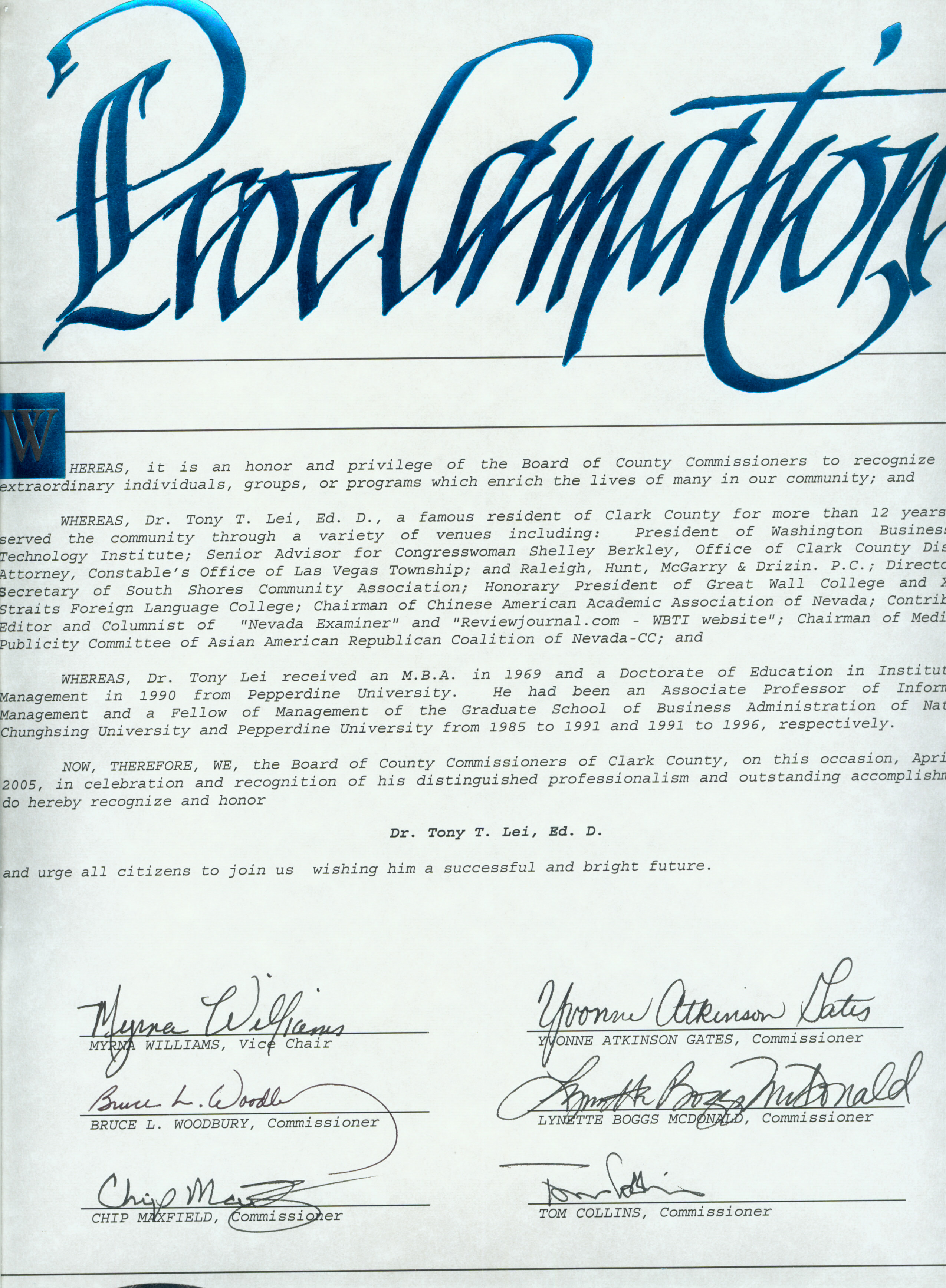 071904-1278 *7 In community service, Dr. Tony Lei's hero is the great servant who has given all for the betterment of others' lives. Let our candles fuel a fire that will fan out an ever-lasting circles. With these circles together we can close our eyes and envision a community that is safe, peaceful, and healthy. The Bible teaches: "...let us not love with words or tongue but with actions and in truth (1 John 3:18)." District (Family) Court Judge-elect Cheryl Moss wrote Dr. Tony Lei, "I am delighted and honored to be appointed as an Associate Fellow of the Public Administration Institution of Washington Business and Technology Institute. Thank you for this opportunity to serve, and I hope to gain more knowledge, insight and awareness about public service and community issues through your prestigious institution. I remain dedicated to helping the community, and I am inspired by your leadership, wisdom and guidance. I am also fortunate to have met you and your wife, Judy, because you are both active and dynamic individuals in the community. Your accomplishments and achievements have demonstrated that taking part in the community does make a difference. Best wishes and thank you again for your unselfish kindness, support, and encouragement."*4 Power in politics should have a direction that the power based on knowledge is the power of righteousness. We wish that a pure fountain may prosper and enrich our spendid and golden country through the spirit that knowledge calls, ultimately, for a life of service. "In God we trust. Life is for the purpose to serve our lovely community," Dr. Tony Lei stated. It is our pleasure to post the following article entitled "It Is Significant to Serve Our Community": Being dedicated to the 17th anniversary celebrating of Seniors United, Lillian and Julian Wallace wrote a feature article entitled "We Proudly Present to You Two of the Dearest People in the World - Dr. and Mrs. Tony T. Lei!" Lillian is President of Seniors United, while Julian is its CEO. The article was published by the famous "Highlights Magazine" on October, 1999. Lillian and Julian wrote that, "Let me clarify, Dr. Tony T. Lei, Ed. D. in Institutional Management with a Dissertation from Pepperdine University in California, is not a medical physician. He is a noted professor and President of Washington Business and Technology Institute. He has a background of achievement as long as his arms. During the past many years it has put efforts on academic research and community service. Due to its achievement, the Institute is advancing with good reputation both locally and internationally. Governor Kenny Guinn is Chairman of its Advisory Board; U.S. Senate Majority Leader Senator Harry Reid is Vice Chairman of the Board and several famous scholars as its Directors. The faculty members of the Institute excel in qualification and work performance." Lillian and Julian have recognized this individual by stating that, "Dr. Lei received M.B.A. and Ed. D. in Institutiional Management from Pepperdine University, Malibu, California. From 1985-1990, he was an Associate Professor of Information Management in the Graduate School of Business Administration of National Chunghsing University, National Taiwan University, National Chengchi University. He has been promoted as a Fellow of Management since February 21, 1993 at Pepperdine University. Since May 4, 1997, he has been appointed by Las Vegas City and Council as Member of Las Vegas Senior Citizens' Advisory Board. He has also been elected Director of South Shores Community Association with concrete contributions to the community for more than 12 years."*5 "Dr. Tony Lei is both excellent in teaching and research with good ability and skill in organization and leadership," pointed out the couple with great accomplishment in political and social services. "Julian and I know the length that Leis go for us. Because of these two terrific, caring people, we were honored by being named as Fellows of the Cultural Institution of WBTI." "The love and friendship that Dr. and Mrs. Tony Lei extend to us is both poignant and meaningful because they are Asian by birth but American by adoption," said Lillian and Julian. "They have also adopted us as their parents because they are so imbused with love and respect for the elderly." "We love you truly and are looking forward to years and years of being together," they stated. "As an outstanding colleague of Pepperdine University and a distinguished alumnus of Tunghai University, Dr. Tony Lei points out: 'Knowledge calls, ultimately, for a life of service. We should continue to wok for the prosperity of our society more diligently.' "Because of his sincere and effective work performance in community service beside his academic endeavor, Dr. Tony Lei has received many important awards from U.S. Senators, U. S. Representatives of the Congress, Las Vegas City Mayor, Clark County Chairmen, and among others. It is significant that Dr. Kenny Guinn, our Governor of Nevada, wrote Dr. Tony Lei: 'It is only with the dedication and commitment of good people like youself that I will achieve my goal of becoming Governor of this great state. Dema and I can't thank you enough for your assistance and your positive activities in the community.'"*6 -------------------------------------------- References *1. GSBPA of WBTI is the initial of the Graduate School of Business and Public Administration of Washington Business and Technology Institute (WBTI). *5. Moss, Cheryl; and Chang, Tiffany. 'It Is Significant to Serve Our Community,' "Newsbrief of WBTI," (November 17, 2000), Las Vegas, Neveda: WBTI. *6. Ibid. *7. For a search of "PPAA18 (Pan Pacific and Asian American Forum)" at 032813-0637 by Google.com. --071904-1278 of LVRJ/wbti: LAF6/wbti -------------------------------------------- ******************************************** | |