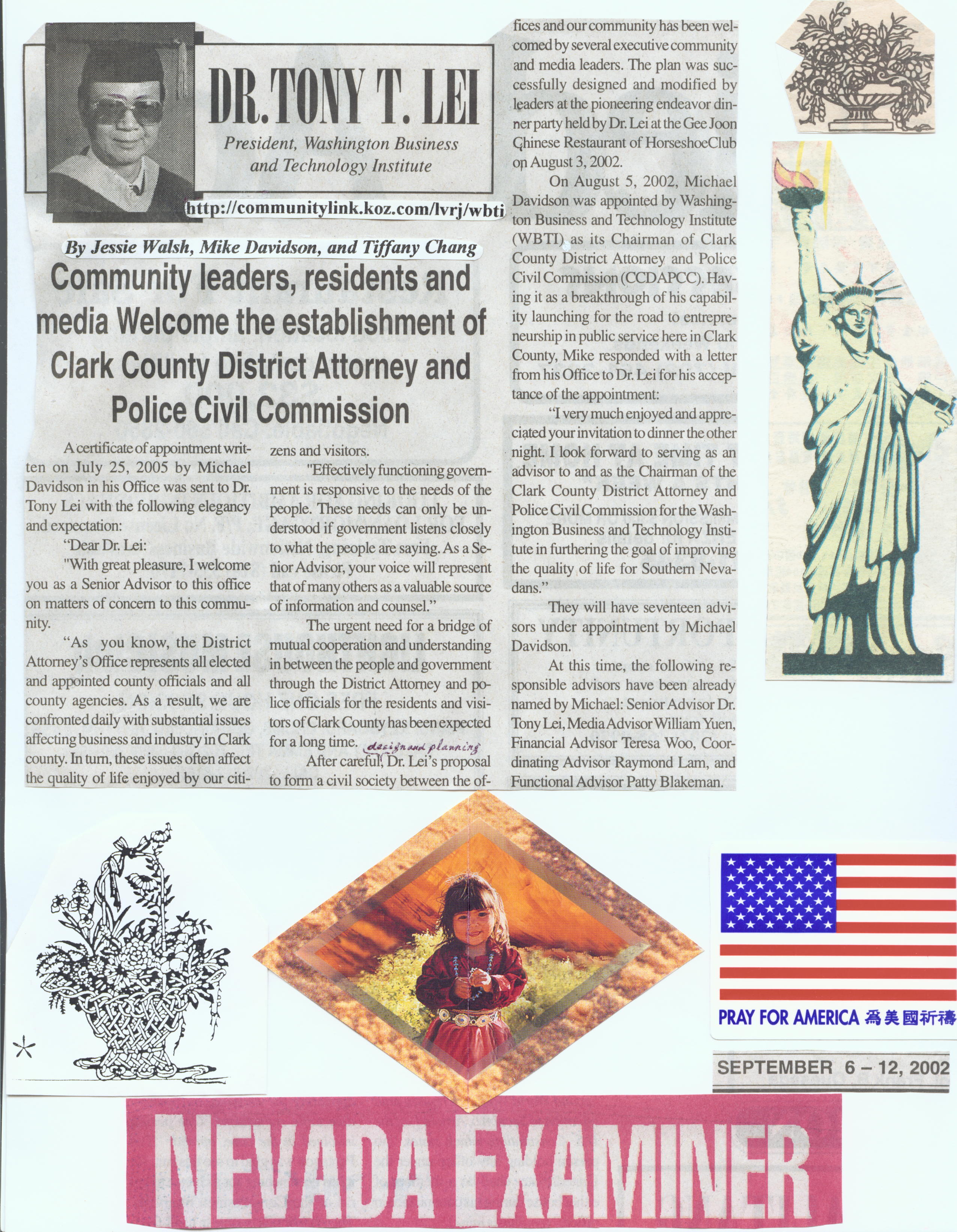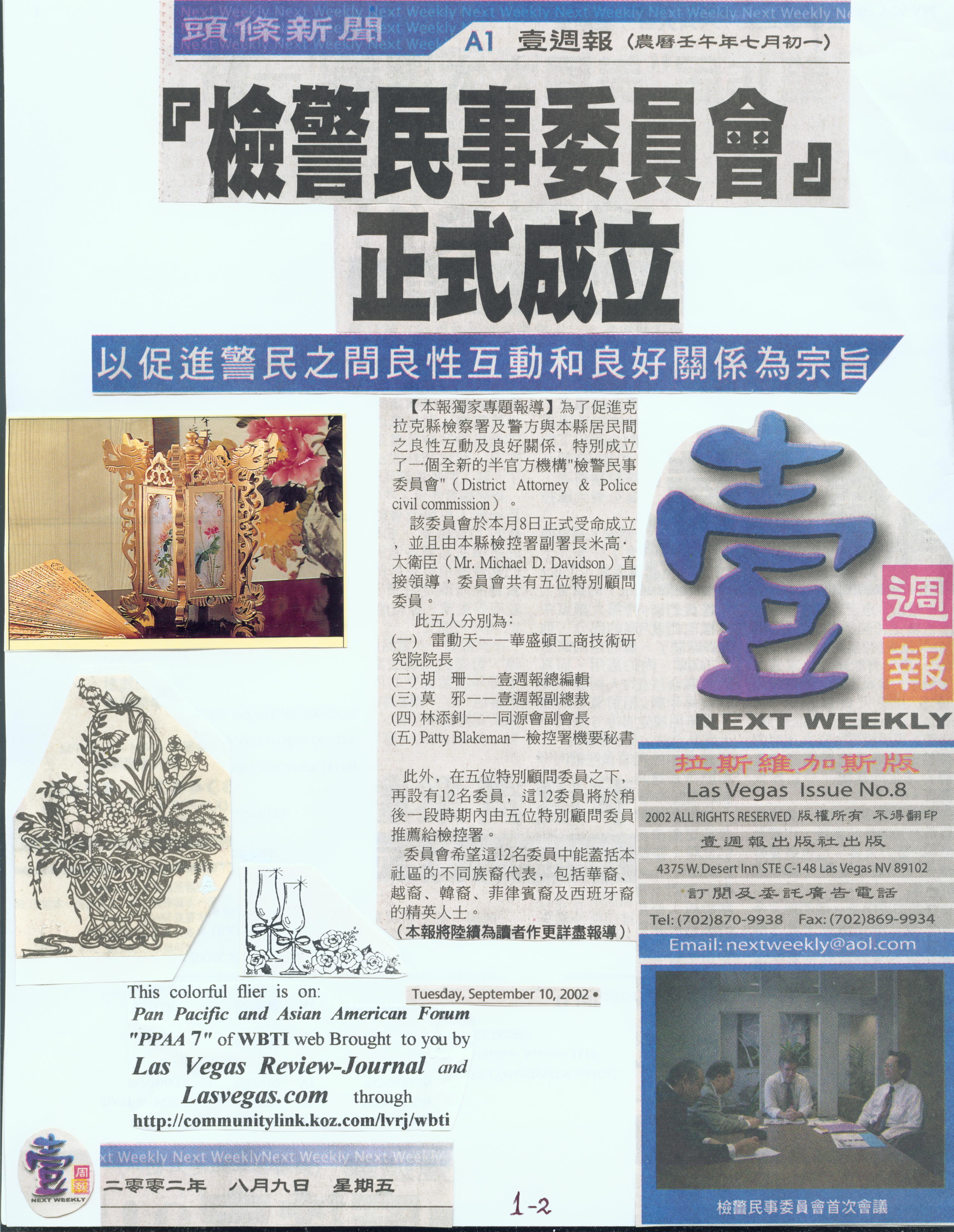 LVRJ/wbti: Dear Judy, This is the info. you required. Thank so much for your help. THAI CULTURAL ART BALL-2013 by : Thai Cultural Art Assoc. of Las Vegas Date : Wed. October 23, 2013. Time: 6.pm-1.am Place : Flamingo Banquet Hall. 3495 E Flamingo Rd. Tel. 702 283 2820 Donations Suggested : $10 /person No Host : Bar, Thai Food, and Snack. FOR TABLES call : SUPATRA 702-772-0027 email : thaiculturalart.lv@hotmail.com : supatratcaalv@hotmail.com With permission we will list your name and address as Supporter and you will be in our mailing list for future events.-------------------------------------- ********************************************* *****LVRJ/wbti: PPAA Forum 21 "It's my great honor to be named by President Dr. Tony Lei as the Honorary Chairman of Clark County District and Police Civil Commission (CCDAPCC) of Washington Business and Technolgy Institute (WBTI)," pointed out the Chief Justice of Nevada Supreme Court William Maupin at the Celebration Party to "Nevada Examiner" and "Reviewjournal.com" at the Steak House of Binion's Horseshoe Club, Las Vegas on October 10, 2002. The Party was held by WBTI to celebrate William Maupin's being appointed as its Fellow of the Public Administration Institution (PAI) and as its Honorary Chairman of the Clark County District Attorney and Police Civil Commission (CCDAPCC). "Please know that I irrevocably stand by my personal commitment to diversity issues in this state and that my sense of patriotism and faith in America stems from its embrace of that diversity." *28 ---------------------------------------- ********************************************* | | |