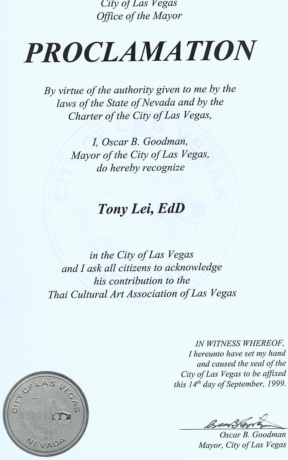 This School, the Graduate School of Business and Public Administration (GSBPA) of WBTI, is proud to have Harry's acceptance as its Professor of Administrative Strategies on May 31, 2003 at the Tea Party by many and most of the community and association leaders of the Asian American Community of Nevada (most of them in Las Vegas).*11
