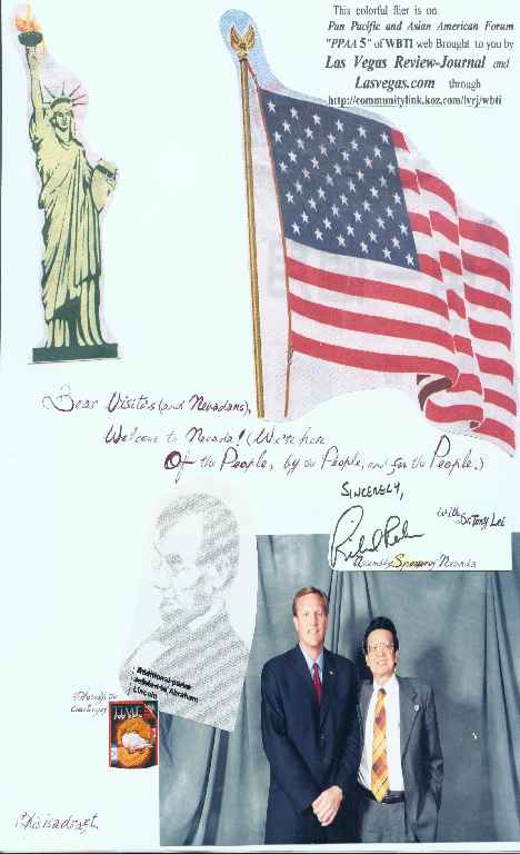 A Special Tribute To U.S. Senator Honorable Harry Reid! by WBTI(NV) Date: Friday, August 24, 2001 Time: 6:30 p.m. - 9:30 p.m. Function: A spicial tribute to U.S. Senator Harry Reid Location: Asia Palace Chinese Restaurant Address: 5485 W. Sahara Ave., Las Vegas, NV 89148 On the cross streets of Sahara and Lindell. Phone: (702) 364-5559 Keynote Speaker: U.S. Senator Honorable Harry Reid Guests of Honor: U.S. Senator John Ensign, U.S. Congresswoman Shelley Berkley, U.S. Congressman Jim Gibbons, Nevada Attorney General Frankie Sue Del Papa, Las Vegas City Mayor Oscar Goodman, and Justice of the Nevada Supreme Court Nancy Becker. Special Guests: *1. Dr. Roy Adamson, Emeritus Professor of Pepperdine University 1'. Mark Alden, Member, Board of Regents, University and Community College System of Nevada 2. Kathy Augustin, Controller, Nevada State 3. Elaine, Secretary of Nancy Becker, Justice of the Nevada Supreme Court 4. Merle Berman, Assemblewoman, Nevada State 5. Denis Brodsky, Las Vegas School Board of Trustees 6. Lisa Brown, Family Court Judge 7. Terry Care, Nevada State Senator and Mrs. Terry Care * 8. C.Y. Chen, Representative, Taipei Economic and Cultural Representative Office in the United States 9. Radha Chanderraj, Commissioner, Nevada Gaming Commission *10. Elaine Chao, Secretary, U.S. Department of Labor (by a representative) 11. Vonne Chowing, Assemblywoman, Nevada State 12. Dr. Sue Fawn Chung, Associate Professor, Department of History, UNLV 13. Bud Cranor, Southern Nevada Director, Governor Kenny Guinn's Office 14. Mark Denton, District Court Judge 15. Robert Gronauer, Constable, Las Vega Township 16. Dirio Harrera, Chairman, Clark County Commission 17. Nadia Jurani, Commissioner, Las Vegas Civil Right Commission *18. Jason C. Hu, Former Representative, Taipei Economic and Cultural Representative Office in the United States 19. Sonia Joya, State Director, U.S. Senator John Ensign Office in Nevada (To represent the Senator.) 20. Jerry Keller, Sheriff, Las Vegas Metropolitan Police 21. Erin Kenny, commissioner, Clark County 22. Cedreic Kerns, Las Vegas Municipal Court Judge 23. Mary Kincaid, Commissioner, Clark County 24. Betsy Kolkoski, Las Vegas Municipal Court Judge *25. Lan Li Ching, Counselor General, People's Republic of China Office of Counselors in Los Anegeles 26. Myron Leavitt, Justice of the Nevada Supreme Court 27. Michelle Leavitt-Fitzpatrick, Las Vegas Municipal Judge 27'. Robert Lueck, Distict Court Judge of Nevada 28. Theresa Malone, Member, Nevada Board of Education (By her Husband, Malone, Past Nevada Senator.) 29. Mark Manendo, Assemblyman, Clark County 30. William Maupin, Justice of the Nevada Supreme Court 31. Lynette Boggs McDonald, Las Vegas City Councilwoman 32. Cheryl Moss, Family Court Judge 33. Judith Ray, Special Representative for U.S. Congressman Jim Gibbons (To represent the Congressman.) 34. Rory Reid, Esq., Former State Democratic Party Chairman 35. Jerry Reynoldeson, Director, Senator Harry Reid's Nevada Office 36. Nancy Saitta, District Court Judge 37. Tod Story, District Director, Congresswoman Shelley Berkley's Office 38. Dr. William Thompson, UNLV Professor of Public Administration 39. Dina Titus, Nevada State Senator *40. Vicotor C. Y. Tseng, Director General, Taipei Economic and Cultural Office in San Francisco 41. Natalie Tyrrell, North Las Vegas Justice Court Judge *42. Virginia Valentine, City Manager of Las Vegas 43. Valorie Vega, District Court Judge 44. Sheri Vogel, Project Administrator, Senior Citizens Law Project, Las Vegas *45. Dr. Kang-pei Wang, President, Tunghai University 46. Jessie Walsh, Las Vegas Municipal Court Judge 47. Steve Wark, Chairman, Nevada Republican Party 48. Myrna Williams, Commissioner , Clark County 49. Dr. Wright, Professor of History, UNLV *50. Ching-mi Wu, Chairman of Board, Tunghai University 51. Dr. Linda Young, Chairperson, Las Vegas Ethics Committee 52. Ann Zimmerman, Las Vegas Municipal Court Judge Chairpersons: Tony Lei, EdD; President, WBTI and Chairman, Chinese American Academic Association of Nevada R. D. Prabhu, MD, Chairperson, CAN-DO Raj Chanderraj, MD, Founder, Friends of India Tonie Sison, Chairperson, Philippine Chamber pf Commerce Rita Vaswani, Executive Staff, CAN-DOHosts: * 1. Kewin Butts, Manager as Representative, Golden Nugget Casino and Hotel (For final confirm.) 2. Raj Chanderraj, Founder, Friends of India 3. Sapatra Chemprachum, Chairperson, Thai Cultural Arts Association of Las Vegas 4. Albert Chang, Publisher, "Las Vegas Chinese Yellow Pages" 5. Yen Wen Cheng, Past Las Vegas Director, (Chinese) "New Asian Weekly" 6. Cathy Chin, Vice President, H. F. Entreprises Co. 7. Andres Costas, MD, Chairperson, Anesthesia Dept., UMC 8. Dolly De Leon, Past President, Philipines Chamber of Commerce 8'. Leonie Domingo, Weststar Funding Mortage *9. Jeny Del Rosario, Past President, Philippines Chamber of Commerce *10. Mark Dunkeson, General Manager, Texas Station Casino & Hotel (For final confirm.) 11. Cathy Endy, Special Coordinator, "Southern Nevada Chinese Weekly" 12. Larry Escalona, Consolidated Century 21 Realtor 13. Larry Espenqiua Larry Espinueva, Vice President, Great Ilocano Association 14. Pia Galapon, Producer/Director, International Entertainment Network *15. Jakie Gaugham, Owner, Plaza Hotel & Casino 16. Sonny Ho, QME, Perpetual Chiropractic Physicians, Inc. 17. Oscar Jomacion, President and Publisher, "Nevada Examiner" 18. Nadia Jurani, Member, Equal Rights Commissioner, Las Vegas 19. Bob Jose, Editor-in-Chief, "Las Vegas Star Magazine" 20. Dr. Nilofar Kuraishi 21. Steve Kwon, Founder, Asian Chamber of Commerce 22. Benson Lee, Esq., Benson Lee Attorney at Law Offices 23. Tony Tung-tien Lei, EdD, Chairman, Chinese American Academic Association of Nevada; President of Washington Business and Technology Institute 24 Jose Lim, Realtor, Country Wide Realty Group Inc. 25. Anthony Lu, Publisher, "Southern Nevada Chinese Weekly" 26. Ann Melton, President, Thai Association of Las Vegas 27. Zen