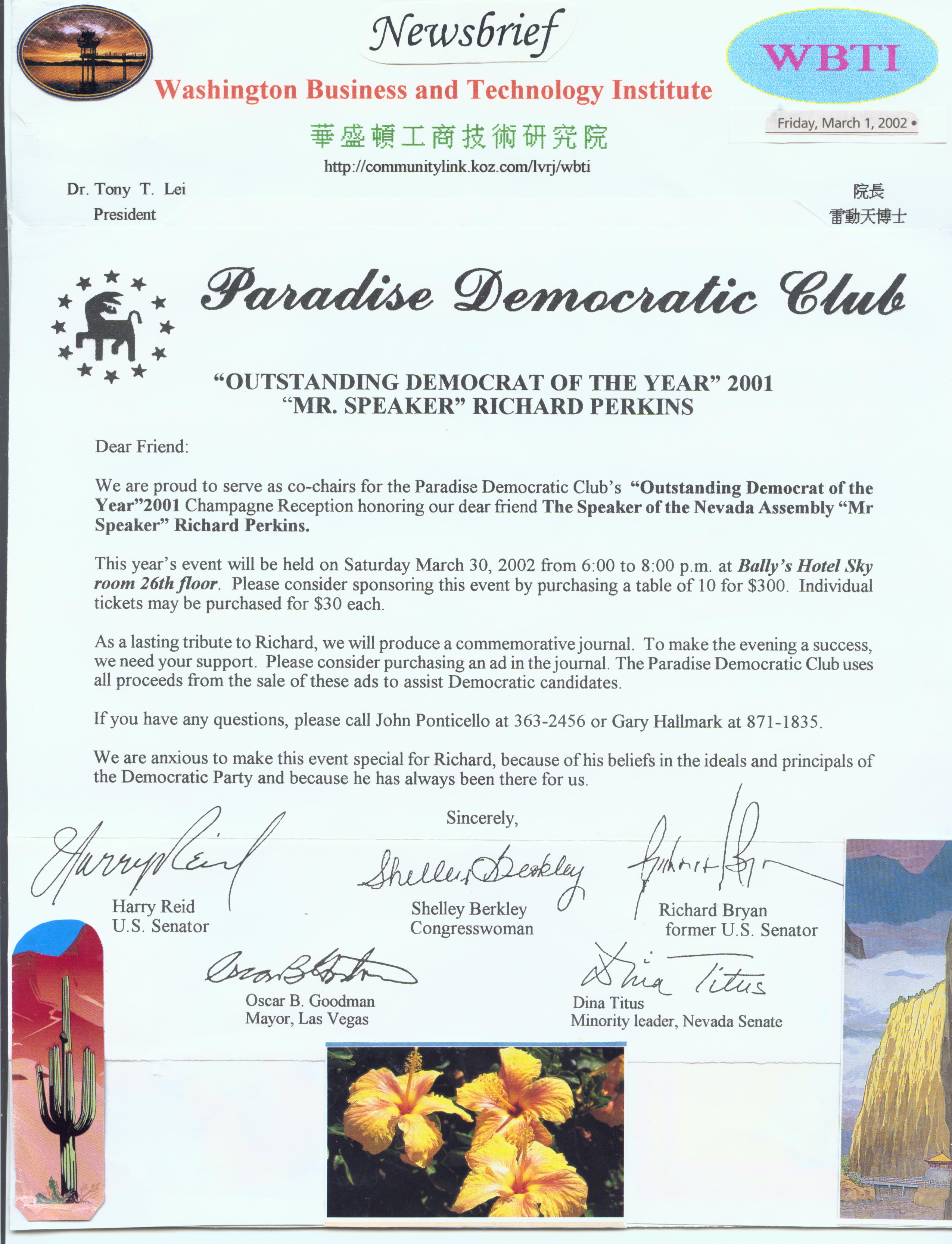 LVRJ/wbti: NEW YEAR BRINGS NEW OPPORTUNITIES The Challenges We Face! [[[Editor's note: The Honorable Lorraine T. Hunt-Bono is a prominent businesswoman, Commissioner on the Nevada Commission on Tourism, a former Lieutenant Governor and President of the Nevada State Senate and chair of The Nevada Business Roundtable!]]] *****Today in Nevada and America, we live in rapidly changing times. The rich heritage of abundant opportunities for hard-working entrepreneurial men and women in America could be slowly eroding and slipping through our fingers. Our younger generations may not have the same advantages for success that those of us had in past decades. Many of the opportunities and successes we experienced were due to hard work, long range planning, and short- and long-term goals, accompanied by clear thinking. ... (from a search by Google.com)021405-6768 Through the courtesy of "Next Weekly" Ò¼ßLˆó. The following article, written by Ī а (Mo Hsai), was published by "Next Weekly" Ò¼ßLˆó on February 10, 2005: *****Long life! We the Chinese! by Ī а (Mo Hsai) ("...With the excellent and informative publication of "Next Weekly", high-ranking officials of Nevada have been inspired help realize the creed for community service and humane spirit of WBTI Nevada," expressed Justice of the Supreme Court Michael Douglas.) LVRJ/wbti: ¹§Ï²©p¹§Ï²!!! *****Äǰ©oÒ»‚€šWÖÞñv·ÇÖÞÍâ½»¹ÙÕfß^¡¸ÖЇøÈ˱³ááÓÐÎåǧÄêÎÄ»¯©o·ÇÖÞÈ˱³ááÖ»ÓÐÐÉÐÉ¡¹©oß@·NÎêÈèµÄÕfÔ’ÊDz»Œ¦µÄ©oÎÒ‚ƒ²»Òª¿´²»Œ¦µÄÄǾä©oÖ»¿´Ç°Ã挦µÄÒ»¾ä©oÖЇøÈ˵ı³ááµÄ´_ÊÇÓÐÎåǧÄêÎÄ»¯©oÓÉÖЇøÊÖÖ¸¿pÖÐÁï³öÒ»ücüc½oÈÕ±¾©oÈÕ±¾±ã®”³É‡ø´âÁË©oÈÕ±¾µÄ»¨µÀ(Œ¢»¨y¼ôy²å) ©p²èµÀ(Œ¢²èÍëÞDÈýËÄÞD) ©p¿ÕÊÖµÀÈáµÀ(ÌÆÊÖС¼¼¶øÒÑ)©o´©ÆßŒÓ¶Y·þµÄºÍ·þ(…Ç´ú·þÑb…Ç·þÒ²) ¡£ ÓÐÎÄ»¯µÄÃñ×å±ãÊÇÓб¾åX©oÄÇÅšvÊ·ÉÏÓж̕ºµÄ¸FÀ§©o½K•þÔÙ¶ÈŠÊ¢Æðí©oß@±ãÊÇÓÐÎÄ»¯¼æÓ¸ҩpÇÚ„Ú©pÐÞðB©pÓЇø¸ñµÄÖÐÈAÃñ×å¡£ ½ñÌìÖЇøÈË‘{ÖøÓÆ¾ÃµÄÎÄ»¯¶øÔÙ¶ÈͦÁ¢ÆðíÁË¡£ÔÚÖЇø´óê‘©o”Ã÷ÇÚ„ÚµÄÖЇø¹¤ÈË©o¹©‘ªÖøÈ«ÇòØ›Îï¶øÀû¼ºÀûÈË©ǫž³µÄëŠÄXÅä¼þ®aÁ¿ÐÛ“þÖøŽˆˆö×ÓÐÂÊ©ǫž³éL˜s؛݆¿‚‡Î»È«Çò×î´ó©r°ÍÄÃñRß\ºÓ¸Û¿Ú¼°¼ÓÄôóµÛ‡øãyÐпØÖÆÔÚÏã¸ÛÀî¼ÎÕ\ÊÖÉÏ©oº£ÍâÈAÈË¿ØÖÆÖøÓ¡Äá©p·ÆÂÉÙe©pÐÂ¼ÓÆÂµÄ½›ú©oßB·ÇÖÞÄáÈÕÀû†ÌƼÒÒ²¿ØÖÆÁËÀ¸ç˹¸ÛµÄï‹Ê³˜I¡£ÃÀ‡øÎù¹ÈÈý·ÖÖ®Ò»ëŠÄXSÓĘ́ž³ÒÆÃñ“íÓЩrIBM ±»Â“ÏëÙIϲ¿·Ý˜I„Õ©rÈAÈËÔÚÃÀ‡ø“íÓÐ×Ô¼º·¿×Ó±ÈÀý×î¸ß©oÖЩp¸Û©p̨ÈýµØÍâ…RÐî‚äÏà¼ÓÊÀ½ç×î¶à©o¿´½ñÌìµÄÖЇøÐÂÄê©oÈ«ÇòÒ²Òª¶àÉÙ½oücÃæ×Ó¼°²Á²ÁÎÒ‚ƒÐ¬©o‚¶ØÓÐһϵÁÐÖЇøßL»î„Ó©ròœ°ÁÈ˵Ĵó·¨ÌmÎ÷Ãñ×åÒ²°lÐÐÖЇøÉúФà]Ʊ©rÐÂÎ÷ÌmÓÐR•þ©r¼ÓÄô󿨵ÙÖZŽˆÍ¬‘cÖЇøÐÂÄê©r¼~¼sŽˆµØ˜ËµÛ‡ø´óÏÃÔÚÖЇø³ýϦÁÁŸô©r¿‚½yÖÝéL°lÎĸæÙRÈAÈËÐÂÄê©rÆÏÌÑÑÀ°Íß_Àû†VˆöÓÐÖЇøÎèª{©rÌ©‡ø¹Ù·½±æÖЇøÐÂÄêÖ÷î}»î„Ó©o×ö‚€ÖЇøÈ˶àïL¹â©o³ÐÕJ×Ô¼ºÊÇÖЇøÈË¶àƒžÔ½¡£ÓÐÎÄ»¯µÄÖЇøÈË©o½ñÌì²»¹ÜÄãÔÚÄÇÑe©oÔÚº£{–|ÃæµĄ̈ž³©oÎ÷ÃæµÄ´óê‘©oÄϷǺÃÍû½Ç»òÓ¡¶ÈÃÏÙI©oÔÚ¼ÓÖÝ©p¾S¼Ó˹©pøP»Ë³Ç¡ÖÐÈAÈËÃñ¹²ºÍ‡ø²»ÄÜÈfšq©oÖÐÈAÃñ‡øÒ²²»•þÈfšq©oµ«ÖÐÈAÃñ×åÒ»¶¨ÈfšqÈfÈfšq©o¹§Ï²¹§Ï²©o×£ÄゃÐÂÄê¿ì˜·!Ò¼ßLˆóÈ«ówͬÈÊ ëuÄêýRÙR!!! ************************** LVRJ/wbti: PPAA Forum 21 "I love Las Vegas because the valley and surrounding mountains provide an unusual beauty that stirs my soul. Even when I'm stuck in traffic, the mountain shadows capture something in my heart. And if I catch a glimpse of Red Rock Canyon National Recreation Area, or the top of Mount Charleston, or Sunrise Mountain at sunset, it brings a moment of peace, even from a distance," wrote Jane Ann Morrison.*17 The dinner guests including Las Vegas Chinese Daily Newspaper Publisher Helen Hesueh & Reporter and Acting Director & Reporter Mindy Gao of Las Vegas World Journal! The food were selected by Mrs. Judy Lei nicely!! Everybody enjoyed a beautiful evening!!! 77777777777777777777777777 77777777777777777777777777777777777777 777777777777777777777777777777777777777777777 | |