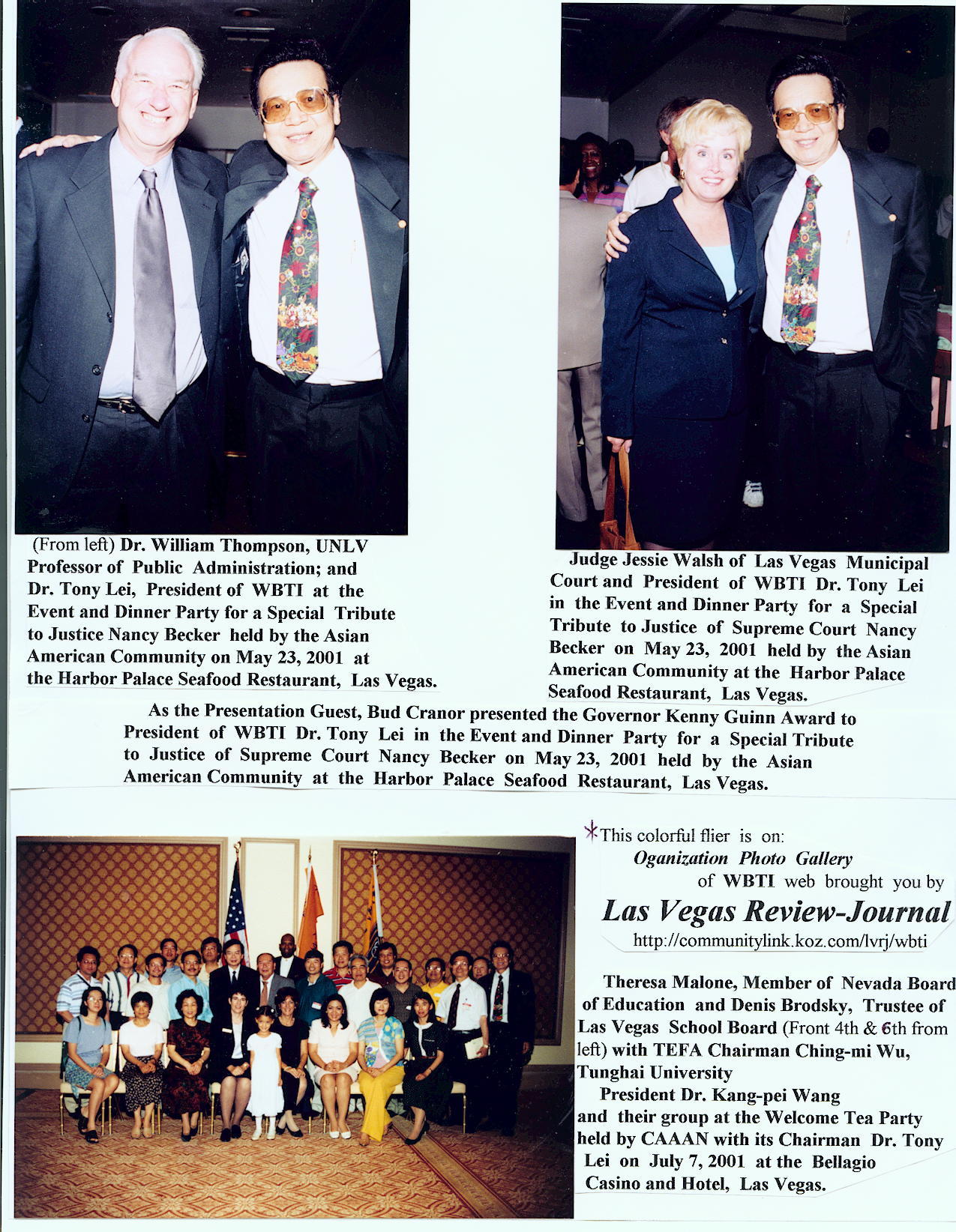 LVRJ/wbti: A Special Tribute To U. S. Senator Honorable Harry Reid! by WBTI(NV) Date: Friday, August 24, 2001 Time: 6:30 p.m. - 9:30 p.m. Function: A spicial tribute to U. S. Senator Harry ReidLocation: Asia Palace Chinese Restaurant Address: 5485 W. Sahara Ave., Las Vegas, NV 89148 On the cross streets of Sahara and Lindell. Phone: (702) 364-5559 Keynote Speaker: U. S. Senator Honorable Harry Reid Guests of Honor: U. S. Senator John Ensign, U. S. Congresswoman Shelley Berkley, U. S. Congressman Jim Gibbons, Nevada Attorney General Frankie Sue Del Papa, Las Vegas City Mayor Oscar Goodman, and Justice of the Nevada Supreme Court Nancy Becker. Special Guests: *1. Dr. Roy Adamson, Emeritus Professor of Pepperdine University 1'. Mark Alden, Member, Board of Regents, University and Community College System of Nevada 2. Kathy Augustin, Controller, Nevada State 3. Elaine, Secretary of Nancy Becker, Justice of the Nevada Supreme Court 4. Merle Berman, Assemblewoman, Nevada State 5. Denis Brodsky, Las Vegas School Board of Trustees 6. Lisa Brown, Family Court Judge 7. Terry Care, Nevada State Senator and Mrs. Terry Care * 8. C.Y. Chen, Representative, Taipei Economic and Cultural Representative Office in the United States 9. Radha Chanderraj, Commissioner, Nevada Gaming Commission *10. Elaine Chao, Secretary, U.S. Department of Labor (by a representative) 11. Vonne Chowing, Assemblywoman, Nevada State 12. Dr. Sue Fawn Chung, Associate Professor, Department of History, UNLV 13. Bud Cranor, Southern Nevada Director, Governor Kenny Guinn's Office 14. Mark Denton, District Court Judge 15. Robert Gronauer, Constable, Las Vega Township 16. Dirio Harrera, Chairman, Clark County Commission 17. Nadia Jurani, Commissioner, Las Vegas Civil Right Commission *18. Jason C. Hu, Former Representative, Taipei Economic and Cultural Representative Office in the United States 19. Sonia Joya, State Director, U.S. Senator John Ensign Office in Nevada (To represent the Senator.) 20. Jerry Keller, Sheriff, Las Vegas Metropolitan Police 21. Erin Kenny, commissioner, Clark County 22. Cedreic Kerns, Las Vegas Municipal Court Judge 23. Mary Kincaid, Commissioner, Clark County 24. Betsy Kolkoski, Las Vegas Municipal Court Judge *25. Lan Li Ching, Counselor General, People's Republic of China Office of Counselors in Los Anegeles 26. Myron Leavitt, Justice of the Nevada Supreme Court 27. Michelle Leavitt-Fitzpatrick, Las Vegas Municipal Judge 27'. Robert Lueck, Distict Court Judge of Nevada 28. Theresa Malone, Member, Nevada Board of Education (By her Husband, Malone, Past Nevada Senator.) 29. Mark Manendo, Assemblyman, Clark County 30. William Maupin, Justice of the Nevada Supreme Court 31. Lynette Boggs McDonald, Las Vegas City Councilwoman 32. Cheryl Moss, Family Court Judge 33. Judith Ray, Special Representative for U.S. Congressman Jim Gibbons (To represent the Congressman.) 34. Rory Reid, Esq., Former State Democratic Party Chairman 35. Jerry Reynoldeson, Director, Senator Harry Reid's Nevada Office 36. Nancy Saitta, District Court Judge 37. Tod Story, District Director, Congresswoman Shelley Berkley's Office 38. Dr. William Thompson, UNLV Professor of Public Administration 39. Dina Titus, Nevada State Senator *40. Vicotor C. Y. Tseng, Director General, Taipei Economic and Cultural Office in San Francisco 41. Natalie Tyrrell, North Las Vegas Justice Court Judge *42. Virginia Valentine, City Manager of Las Vegas 43. Valorie Vega, District Court Judge 44. Sheri Vogel, Project Administrator, Senior Citizens Law Project, Las Vegas *45. Dr. Kang-pei Wang, President, Tunghai University 46. Jessie Walsh, Las Vegas Municipal Court Judge 47. Steve Wark, Chairman, Nevada Republican Party 48. Myrna Williams, Commissioner , Clark County 49. Dr. Wright, Professor of History, UNLV *50. Ching-mi Wu, Chairman of Board, Tunghai University 51. Dr. Linda Young, Chairperson, Las Vegas Ethics Committee 52. Ann Zimmerman, Las Vegas Municipal Court Judge Chairpersons: Tony Lei, EdD; President, WBTI and Chairman, Chinese American Academic Association of Nevada R. D. Prabhu, MD, Chairperson, CAN-DO Raj Chanderraj, MD, Founder, Friends of India Tonie Sison, Chairperson, Philippine Chamber pf Commerce Rita Vaswani, Executive Staff, CAN-DO Hosts: * 1. Kewin Butts, Manager as Representative, Golden Nugget Casino and Hotel (For final confirm.) 2. Raj Chanderraj, Founder, Friends of India 3. Sapatra Chemprachum, Chairperson, Thai Cultural Arts Association of Las Vegas 4. Albert Chang, Publisher, "Las Vegas Chinese Yellow Pages" 5. Yen Wen Cheng, Past Las Vegas Director, (Chinese) "New Asian Weekly" 6. Cathy Chin, Vice President, H. F. Entreprises Co. 7. Andres Costas, MD, Chairperson, Anesthesia Dept., UMC 8. Dolly De Leon, Past President, Philipines Chamber of Commerce 8'. Leonie Domingo, Weststar Funding Mortage *9. Jeny Del Rosario, Past President, Philippines Chamber of Commerce *10. Mark Dunkeson, General Manager, Texas Station Casino & Hotel (For final confirm.) 11. Cathy Endy, Special Coordinator, "Southern Nevada Chinese Weekly" 12. Larry Escalona, Consolidated Century 21 Realtor 13. Larry Espenqiua Larry Espinueva, Vice President, Great Ilocano Association 14. Pia Galapon, Producer/Director, International Entertainment Network *15. Jakie Gaugham, Owner, Plaza Hotel & Casino 16. Sonny Ho, QME, Perpetual Chiropractic Physicians, Inc. 17. Oscar Jomacion, President and Publisher, "Nevada Examiner" 18. Nadia Jurani, Member, Equal Rights Commissioner, Las Vegas 19. Bob Jose, Editor-in-Chief, "Las Vegas Star Magazine" 20. Dr. Nilofar Kuraishi 21. Steve Kwon, Founder, Asian Chamber of Commerce 22. Benson Lee, Esq.,Benson Lee Attorney at Law Offices 23. Tony Lei, EdD, Chairman, Chinese American Academic Association of Nevada 24 Jose Lim, Realtor, Country Wide Realty Group Inc. 25. Anthony Lu, Publisher, "Southern Nevada Chinese Weekly" 26. Ann Melton, President, Thai Association of Las Vegas 27. Zenny Mendoza, Former President, Golden Agila Lions Club