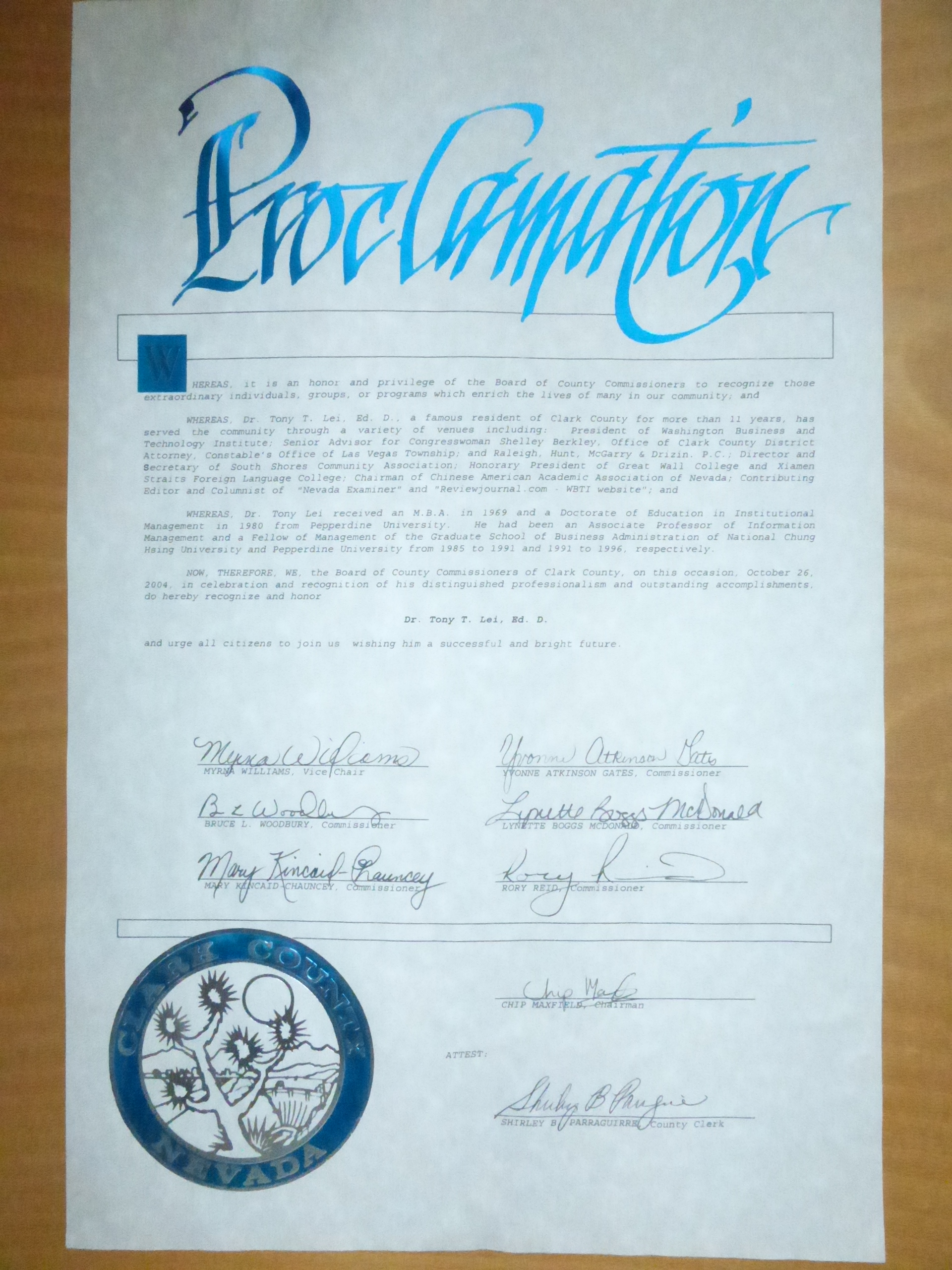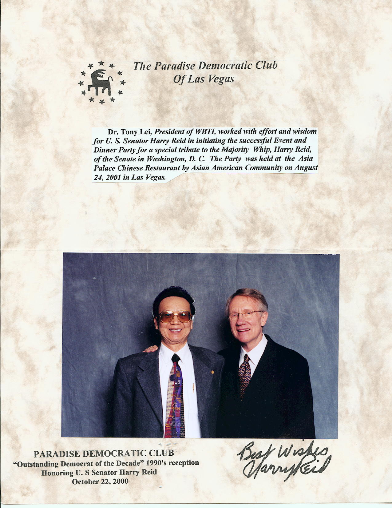 LVRJ/wbti: Nevada State and WBTI welcomed and commended heartily TEFA and Tunghai Reunion! U.S. Senator Harry Reid awarded TEFA and CAAAN!! by Valerie Weber, Cheryl Moss, and Tiffany Chang*1[[[A friend is someone who concerned with everything you do. A friend is someone to call upon during good and bad times. A friend is someone who understands whatever you do. A friend is someone who knows what you are going through at all times. A friend is someone who does not compete with you. A friend is someone who is genuinely happy for you when things go well. A friend is someone who tries to cheer you up when things don't go well. A friend is an extension of yourself without which you are not complete. Thank you for being my friend!!! --Susan Polis Achultz]]] ------------------------------------------ Starting from July 4th, Independence Day, to 8th were a long holiday season for casinos and tourist industries in Las Vegas. Numerious visitors were crowding to here, yet Tunghai University had brought good conference and reunion news for Chinese American academic community of Nevada. On July 6, 2001, gathering to Las Vegas had been the directors and membes of Tunghai Endowment Fund for Academic Advancement (TEFA) and 12 - 13th classes of Tunghai Reunion. VIPs of ten individuals including Dr. Kang-pei Wang, President of Tunghai University, Mr. Bridge I-yu Teng, Executive Director of TEFA, were invited by Dr. Tony T. Lei, President of Washington Business and Technology Institute (WBTI) to have champagne and delicious foods dinner at Gee Joon Chinese Restaurant of Horseshoe Casino and Hotel. Dr. and Mrs. Tony T. Lei were the hosts. Representative Gerri Schroder of U.S. Congresswoman Shelley Berkley brought the achievement certificates to TEFA and CAAAN by Congresswoman Shelley Berkley to the dinner party. TEFA returned with the best Taiwanese box of tea to Shelley. After the pleasent and rich dinner, all the party group were treated to enjoy the famous show "Naked Angeles" by Dr. and Mrs. Lei.*2 On the 7th of July, a Welcome Tea Party was held by Dr. Tony T. Lei, President of Washington Business and Technology Institute (WBTI) and Chairman of Chinese American Academic Association of Nevada (CAAAN) and and his wife Mrs. Judy K. Lei. It was held for the celebrating of the incorperation of TEFA USA and the Global Tunghai Reunion in Las Vegas. In the conference, Dr. Tony T. Lei expressed sincerely and heartily the welcome in his short speech to both the Corperation and Reunion. He then introduced Theresa Malone, Member of the Nevada Board of Education, and Denise Brodsky, Las Vegas School Board of Trustees to deliver their welcome speeches. Malone spoke for U. S. Senator Harry Reid's welcome to the Conference and announced Reid's certificates of commendation to TEFA and CAAAN. "Yet, with our differences we have a goal that is the same: to provide many opportunities for our citizens to learn and develop their knowledge, skill, mind, and character by formal schoolling," Malone said. "With support of organizations as the Tunghai Endowment Fund for Academic Advancement, and the Washington Business and Technology Institute, but most importantly You, we will fulfill our goal to promote opportunities for education. On behalf of the Nevada education community, thanks you for sharing your time and goals with us," she added.*3 Brodsky announced in her welcome speech that Congresswoman Berkley was giving TEFA and CAAAN each a certificate of commendation. She recognized that Mayor, WBTI, among others are sharing their same legacy to include building Las Vegas a community where future generations will have even more opportunities and advantages to live a prosperous life. The highlight of the tea party at Bellagio was the Congressional Recognition by Congresswoman Shelley Berkley presented through Malone and Brodsky to TEFA and CAAAN. On behalf of the TEFA, Chairman Wu and President Wang of Tunghai University received the Certificate. Dr. Lei also received the Award for CAAAN from Berkley. Thunders of applause from all the guests and participants brought a climax of this event in the Conference Room of Renoir 2 during the presentation of the awards. Chairman Wu gave a thanks speech to appreciate Senator Reid, Congresswoman Berkley, and Chairman Dr. Lei. for their hospitable welcome and supports. He was acknowledged the invitation by Reid to meet the Senator through Dr. Lei. President Dr. Tony T. Lei of WBTI, Chairman of CAN-DO Dr. Prabhu, among others were going to hold a significant theme party and dinner in August for Reid in congratulating his being the Majoity Whip of U. S. Senate. Dr. Kang-pei Wang, President of Tunghai University, was also invited to give a speech. He thanked the nice welcome and supports by the Washington, D.C. Scene, Nevada State, Las Vegas City, and Clark County. Acknowledgement was that this has been one inspired revelation that Dr. Tony Lei's long years of honest and excellent efforts to coummunity service in Nevada have been significant and fruitful. He said that Tunghai University is a developed university with many departments, graduate schools, and colleges. The diligent attitude of teaching by professors and the concrete research accomplishment of the graduate schools have launching this University to one of the famous educatonal institutions in the world. He also welcomed all Nevadans come to visit Taiwan and Tunghai University. U. S. Senior Senator of Nevada Harry Reid, the second greatest and powerful character (now Majority Leader) of the Senate in Washington D. C., gave a Certificate of Commendation of the U. S. Senate to Chinese American Academic Association of Nevada (CAAAN). It gave credit to CAAAN for "In Recognition of Your Outstanding Support and Contribution to the TEFA and Global Tunghai Reunion in Las Vegas, Nevada." Dr. Tony T. Lei, Chairman of CAAAN and his wife Judy received the award in the Senator Reid's Office on July 16, 2001. TEFA also received a certificate becau