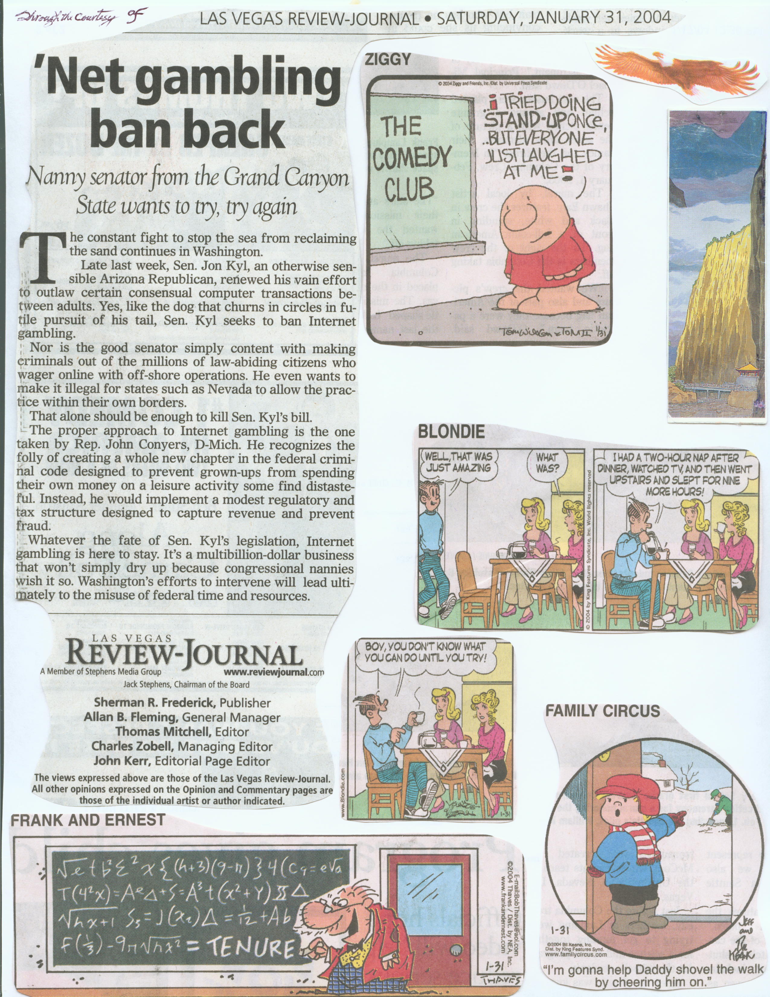Newsbrief ***** 4:07 p. m., Friday, January 30, 2004 ***** # First Edition Washington Business and Technology Institute (WBTI) http://communitylink.koz.com/lvrj/wbtiAdvisory Board: Governor Kenny Guinn, Chairman; U. S. Senators Harry Reid and John Ensign, Vice Chairmen; U. S. Representatives James Gibbons and Shelley Berkley, and Las Vegas Mayor Oscar Goodman, Executive Directors. U. S. Secretary of Labor Elaine Chao Chairperson Dr. Tony T. Lei President District Judges Mark Denton and Valorie Vega Vice Presidents Dr. William N. Thompson Director of Public Administration Institution Dr. E. Lee Bernick and Dr. G. Keong Leong Deans of Graduate School of Business and Public Administration Dr. Sue Fawn Chung Director of Culture Institution Justice of the Supreme Court William Maupin, Attorney General Brian Sandoval, and District Judge Stewart Bell, Honorary Chairmen of Clark Count District Attorney and Police Civil Commission (CCDAPCC) District Attorney David Roger and Clark County Sheriff Bill Young Chairmen of CCDAPCC (702) 255-9058 --------------------------------------------------------------------------------------- I fight my way in life for Nevada By Office of Senator Harry Reid "Reid for Nevada" *1 Reid Secures Money for Transportation Projects Included in the Omnibus Appropriations Act passed by the Senate are nearly $80 million for transportation projects that will create jobs and improve the quality of life in Nevada. Among the funding secured by Senator Harry Reid is $20 million to continue construction of the Las Vegas monorail; $8.8 million for renovations at four Nevada airports; $8 million for widening of US 95 in southern Nevada; $7 million for continued development of the Hoover Dam Bypass; and $2 million for improvements of I-80 in northern Nevada. "Reid Demands Answers from DOE" After he learned that some Yucca Mountain workers had been exposed to silica and could have contracted the deadly disease silicosis, Senator Reid sent a letter to Department of Energy Secretary Spencer Abraham asking for answers about worker safety precautions at the site. "Reid Praises Plan to Rebuild Moulin Rouge" In a statement in the Senate this week, Senator Reid praised plans to rebuild Las Vegas' historic Moulin Rouge Hotel, which was the first integrated hotel in Nevada when it opened in 1955. Plans call for restoration of the original façade and hotel, along with construction of a new hotel, casino, and shopping mall. This new facility will include museum exhibits that celebrate the history of the property and the achievements of the Civil Rights era. Two Nevada students from the Presidential Classroom program, Sarah White of Fallon and Shigetatsu Miakashi of Mesquite, visit with Senator Reid. Presidential Classroom takes students behind the scenes in our nation's capital for seminars and discussions featuring members of Congress, Presidential appointees, journalists and other Washington insiders and names in the news. INSIDER'S CALENDAR The Senate will convene Monday, February 2 at 1:00 p.m., with a period of morning business until 2:00 p.m. At 2:00 p.m. the Senate will resume consideration of the motion to proceed to S. 1072, the highway bill. Cloture was filed on the motion to proceed to the Highway bill. The vote on cloture will occur at 5:45 p.m. The highway bill is expected to consume most of the remaining time before the Senate recess beginning on February 16. "Week in Review" No Weapons of Mass Destruction Stockpiles in Iraq - That was the finding of former Chief Weapons Inspector David Kay when he testified before the Senate Armed Services Committee on Wednesday. Kay went on to say that it was unlikely large stockpiles would be found, that pre-war intelligence was wrong, and that an independent outside investigation into the intelligence failure is warranted. The Senate Intelligence Committee is in the process of completing its review of Iraqi pre-war intelligence, but thus far the White House has opposed calls for an independent review. Budget Details Expected on Monday- Details of the President's Fiscal Year 2005 budget request are expected to be released on Monday, February 2. The President will reportedly seek increases of 7 percent for defense spending and 10 percent for Homeland Security programs. Other executive departments will see, on average, a 1 percent increase. These details emerged on the heels of troubling budget news, as one-year deficit projections were adjusted this week to exceed $500 billion, and costs of the new Medicare prescription drug bill were revised upward by about $140 billion. Pension Reform Bill Passes; Highway Bill Next On Agenda- On Wednesday the Senate approved a pension funding bill that would provide relief to financially strapped companies by lowering the amount of their pension contributions over the next two years. Supporters predicted the bill will aid the survival of companies in the steel, airline and manufacturing sectors, and ultimately lead to more solvent pension funds. The Senate will next take up the six-year, $311 billion highway bill. Debate and passage of the bill could take at least two weeks. "Reid's Words" "Last month the Supreme Court upheld the major provisions of the Bipartisan Campaign Reform law. This capped a remarkable eight-year effort by Senators John McCain and Russ Feingold. Their bill will renew the vitality of our political system and restore faith in our government."*2 ------------------------------------ References *1. Assistant Democratic Leader. 'Whip Round Up' "An eamil to Dr. Tony Lei from the Office of U. S. Senator Harry Reid," (January 30, 2004), Washington, D. C.: Ofiice of the Assistant Democratic Leader. *2. Ibid. 3333333333333333333 555555555555555555555555555555 777777777777777777777777777777777777777777777 *************************************************** | |