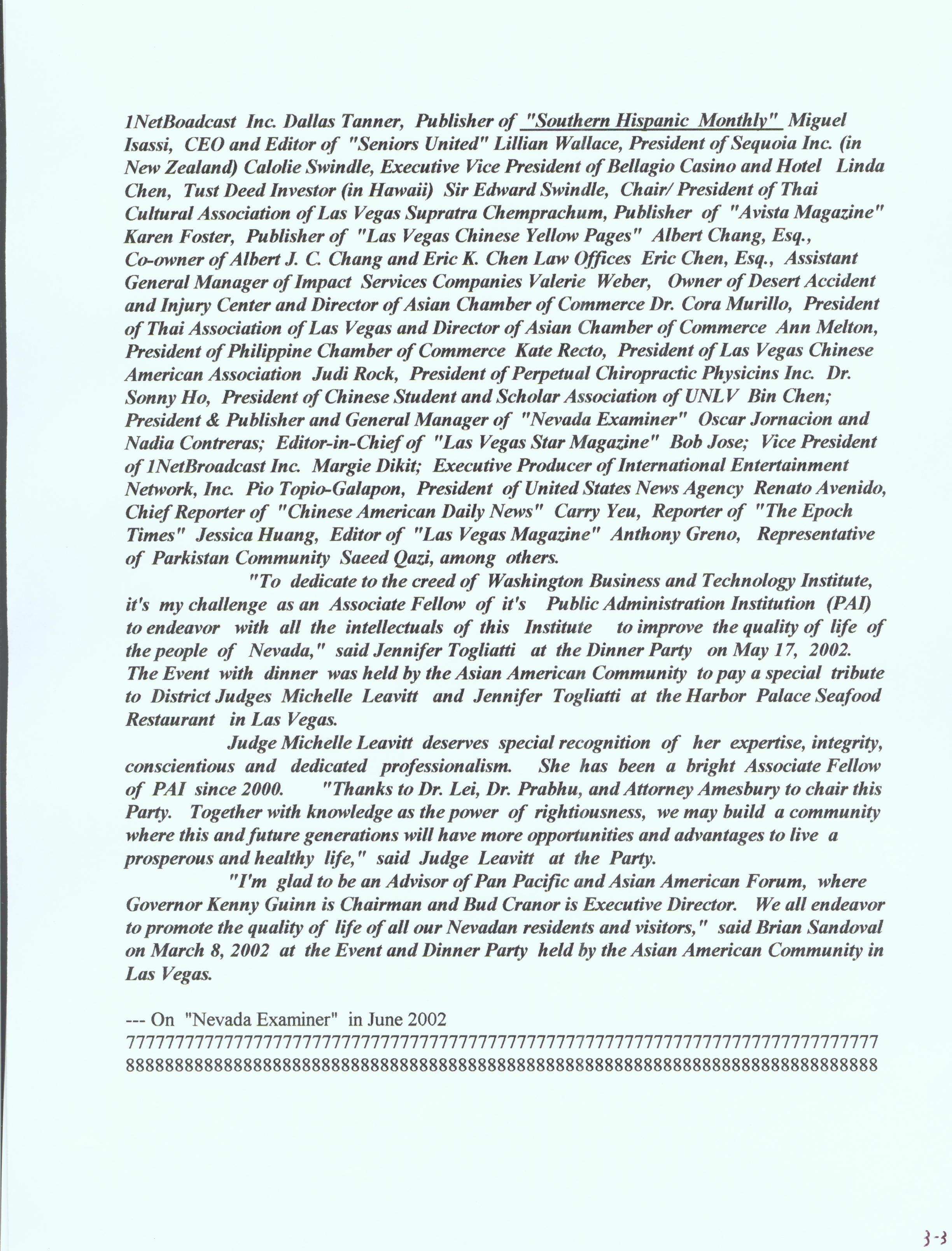 Eighth Judicial District Court Clark County Courthous 200 South Third Street Las Vegas, Nevada 89155-2373Mark R. Denton District Judge Department Thirteen (702) 455-431 Fax (702) 384-1515 October 3, 2003 Dear Dr. and Mrs. Lei, Thank you so very much for hosting the wonderful dinner a couple of weeks ago. It was great talking to you and your other guests and the food was delecious. We very much appreciate your friendship and kindness. Please take care. Very truly yours, Mark ------------------------------------------------------------------------------------------------------------------ Dr. Tony T. Lei, President of WBTI and Chairman of Chinese American Academic Association of Nevada and Mrs. Judy K. Lei request the honor of your presence as a Guest of Honor at the Event and Dinner Party for A Special Tribute to Nevada Controller Kathy Augustine; Justice of Supreme Court Bill Maupin; Commissioner Rory Reid; Sheriff Bill Young; District Judges Mark Denton, Jessie Walsh, Jackie Glass, and Valorie Vega; and Chief Judge Toy Gregory Theme: Light Candles along the Silver Stream of Southern Nevada with Clark County District Attorney and Police Civil Commission on Wednesday, the 17th of September, 2003 at Zax Restaurant of Golden Nugget Casino & Hotel 129 E. Sahara Ave., Las Vegas, Nevada 89125 from 6:30 p.m. - 9:30 p.m. 77777777777777777777777777777777777777777777 8888888888888888888888888888888888888888888888888888 | | | Go To Page: [1][2][3][4][5][6][7][8][9][10][11][12][13][14][15][16][17][18][19][20][21][22][23][24][25][26][27][28][29][30][31][32][33] 34 [35][36][37][38] | |
