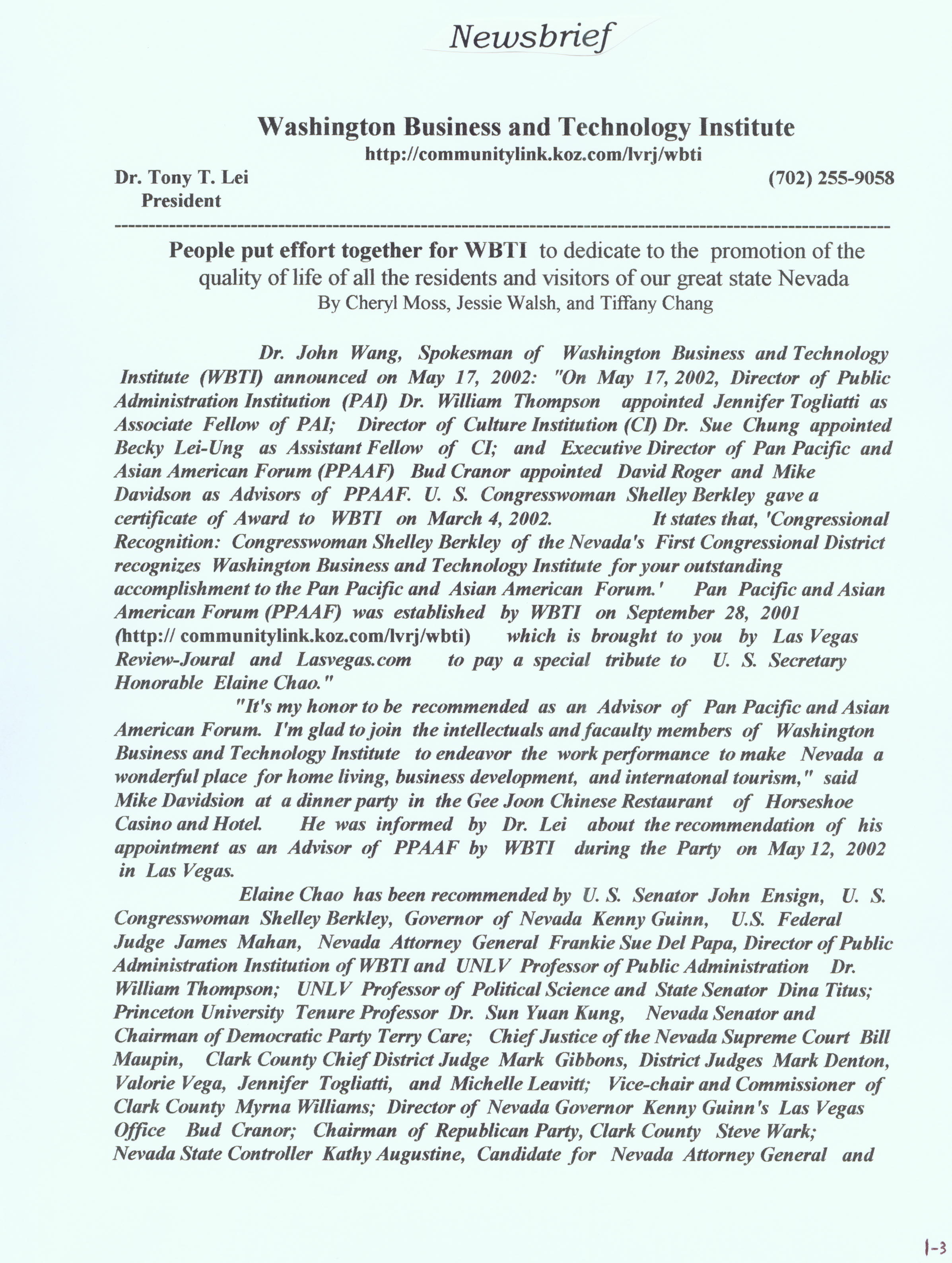 A theme of the event and dinner party to pay a special tribute to The Supreme Court Justice Nancy Becker: Growing Value of the Fellowship of Public Administration Institution By Tiffany Chang Washington Business and Technology Institute (WBTI) was founded in January 8, 1996. We have produced distinguished scholars, successful entrepreneurs, and outstanding community leaders. For the time being, our vision of 2001 is to continue to put more wisdom and effort in encourageing those people who are outstanding in academic research and community service. WBTI has established the Public Administration Institution (PAI) in order to meet the increasng investigation requirements of current public managers and special research needs of professional public administrators. It seeks to provide an awareness and understanding of the complex administrative and oganizational contexts within which the administrators of public service make and implement decisions; and to provide general technical competence in using the tools of public administration and information management. Dr. William N. Thompson was appointed by WBTI as Fellow and Director of its Public Administration Institution (PAI) on January 18, 2000. "It has been an honorable gratifying to invite a famous professor of Dr. Bill Thompson's expertise, integrity, and good personal traits with highly international perspective to this Institute," Said President Dr. Tony Lei of WBTI on January 21, 2000. "Throughout Dr. Thompson's distinguished career and publication, he has been earned a good reputation as a conscientious and dedicated professional." On March 3, 2000, Dr. Roy J. Adamson was appointed Fellow of PAI. "It's our gratifying honor to have Dr. Adamson, a famous Emeritus Professor from Pepperdine University to join us as one of our faculty member. The fellowship of Dr. Adamson with both of his expertise and integrity has brought PAI the milestone to an interstate research institution in the United States," said Dr. Tony Lei. Nancy A. Becker was appointed by WBTI as Fellow of PAI on May 2, 2000. Nancy received her Juris Doctorate degree from George Washington University National Law Center in 1979. She is now a Justice of Nevada Supreme Court. She is the recipient of numerous honors. "It's our honor to invite a famous person of Justice Nancy Becker's excellenct caliber whose expertise, integrity, and good personal traits will bring this Institute wih a perspective of millennium," said Dr. Tony Lei on May 18, 2000. "Throughout her distinguished career, she has accomplished a great deal of judicial practices together with social services and has earned a good reputation of conscientious and dedicated professionalism." As a born-again Christian, people had been inspired by U. S. Senator-elect John Ensign's sincerity, humanility, and credibility more than just his wealth and good looks in last November. In view of his admirable qualities, achievements, passion, and unshakable belief in building a better Nevada, WBTI led by Dr. Tony Lei, a fellow sincere believer, honored him as Advisor and Vice Chairman of its Advisory Board on November 8, 2000. "It's a very prestigious honor to be appointed by WBTI as an Associate Fellow of PAI. WBTI is a very well respected and integral part of this community. I'm grateful to be joining such a distinguished panel of professionals who are committed to improving the lives of our citizens in this community. We've our Director and Fellow Dr. William Thompson; Fellows Nancy Becker, Dr. Roy Adamson, Mark Denton, Valorie Vega, Terry Care; Associate Fellows Lisa Brown, Cheryl Moss, Mary Kincaid, Lynette McDonald, Michelle Leavitt-Ftzpatrick, Cedric Kerns, Jessie Walsh, Betsy Kolkoski, Ann Zimmerman, Natalie Tyrrell, Sheri Vogel; Research Associate Sonya Douglass; Assistant Iris Zhang," said Judge Ann Zimmerman. By the act of love itself, we are enriched. Love in action is service above self. Make service a part of our character and experience the abundant reward that comes from serving others. The Bible teaches: "... let us not love with words or tongue but with actions and in truth ( 1 John 3:18)." District ( Family ) Court Judge Cheryl Moss wrote Dr. Tony Lei : "I am delighted and honored to be appointed as an Associate Fellow of the Public Administration Institution of Washington Business and Technology Institute. Thank you for this opportunity for me to serve, and I hope to gain more knowledge, insight, and awareness about public service and community issues through your prestigious institution. I remain dedicated to helping the community, and I am inspired by your leadership, wisdom, and guaidance. I am also fortunate to have met you and your wife, Judy, because you are both active and dynamic individuals in the community. Your accomplishment and achievement have demonstrated that taking part in the community does make a difference. Best wishes and thank you again for your unselfish kindness, support, and encouragement." "Even with the constancy of his presidential responsblities, Tony ( Dr. Tony Lei ) carved out time and energy during the past three years with wisdom and knowledge through the cooperation of Dr. William Thompson to create the blueprint for the Institution that ultimately paved the way for the 2000 openning of our Public Administration Institution (PAI) of Washington Business and Technology Institute (WBTI)," said Justice of the Supreme Court Nancy Becker for "Nevada Examiner " on June 30, 2000. "Public Administraton Institution of WBTI has played the role as a private NPO (Non Pofit Organization) to promote the study and research of public administration and strategy for social and public benefit. With the effort of the Faculty and under the brilliant leadership of Dr. Tony Lei, WBTI has accomplished a valuable contribution to the academic research and community service for Nevada. We share a great deal of honor also as what the Justice of the Supreme Court Nancy Becker does for her prestige as a PA