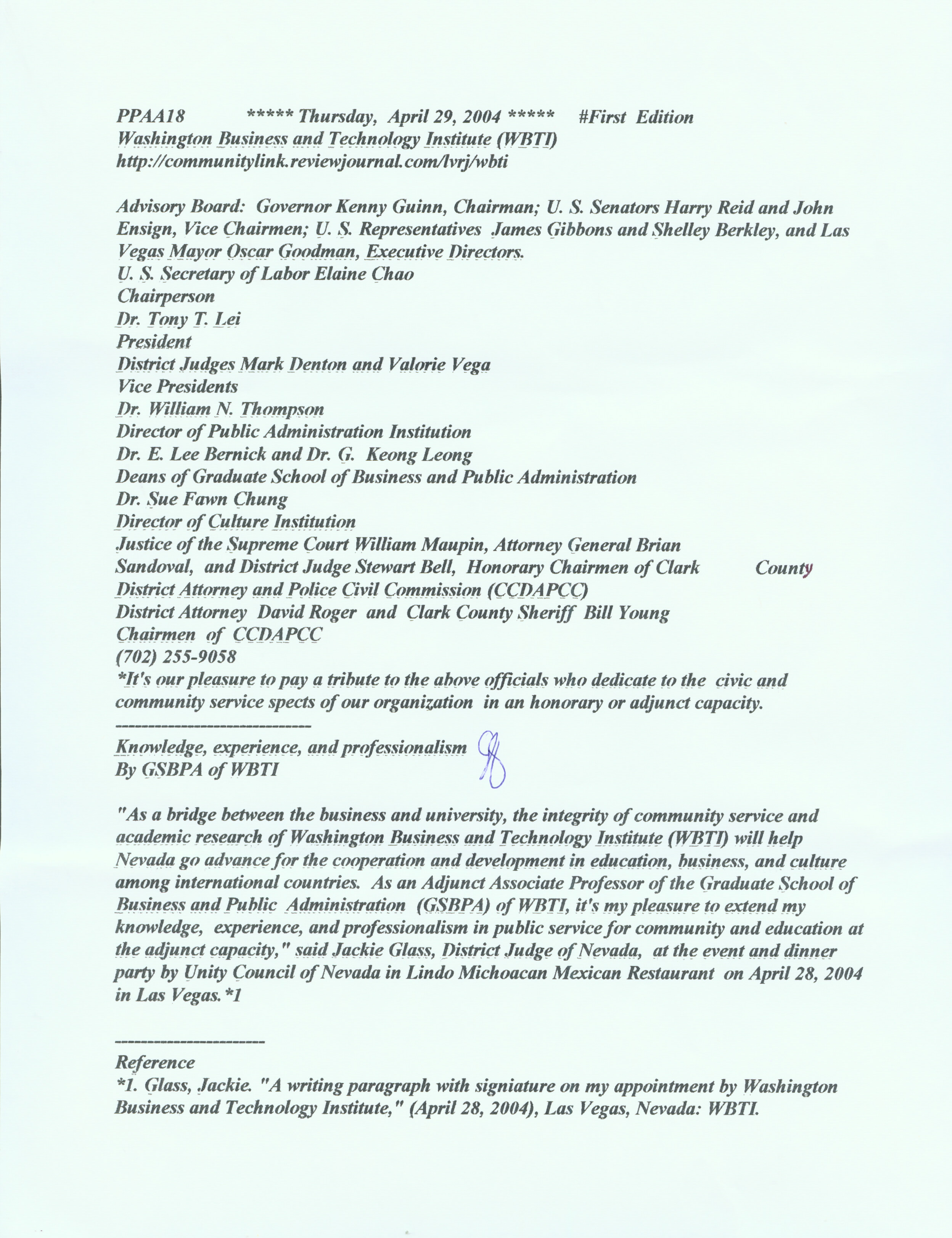 PPAA18 ***** Thursday, April 29, 2004 ***** #First Edition Washington Business and Technology Institute (WBTI) http://communitylink.reviewjournal.com/lvrj/wbtiAdvisory Board: Governor Kenny Guinn, Chairman; U. S. Senators Harry Reid and John Ensign, Vice Chairmen; U. S. Representatives James Gibbons and Shelley Berkley, and Las Vegas Mayor Oscar Goodman, Executive Directors. U. S. Secretary of Labor Elaine Chao Chairperson Dr. Tony T. Lei President District Judges Mark Denton and Valorie Vega Vice Presidents Dr. William N. Thompson Director of Public Administration Institution Dr. E. Lee Bernick and Dr. G. Keong Leong Deans of Graduate School of Business and Public Administration Dr. Sue Fawn Chung Director of Culture Institution Justice of the Supreme Court William Maupin, Attorney General Brian Sandoval, and District Judge Stewart Bell, Honorary Chairmen of Clark County District Attorney and Police Civil Commission (CCDAPCC) District Attorney David Roger and Clark County Sheriff Bill Young Chairmen of CCDAPCC (702) 255-9058 *It's our pleasure to pay a tribute to the above officials who dedicate to the civic and community service spects of our organization in an honorary or adjunct capacity. ------------------------------ Knowledge, experience, and professionalism By GSBPA of WBTI "As a bridge between the business and university, the integrity of community service and academic research of Washington Business and Technology Institute (WBTI) will help Nevada go advance for the cooperation and development in education, business, and culture among international countries. As an Adjunct Associate Professor of the Graduate School of Business and Public Administration (GSBPA) of WBTI, it's my pleasure to extend my knowledge, experience, and professionalism in public service for community and education at the adjunct capacity," said Jackie Glass, District Judge of Nevada, at the event and dinner party by Unity Council of Nevada in Lindo Michoacan Mexican Restaurant on April 28, 2004 in Las Vegas.*1 ----------------------- Reference *1. Glass, Jackie. "A writing paragraph with signature on my appointment by Washington Business and Technology Institute," (April 28, 2004), Las Vegas, Nevada: WBTI. 77777777777777777777 888888888888888888888888888888888 777777777777777777777777777777777777777777777 ************************************************ | |