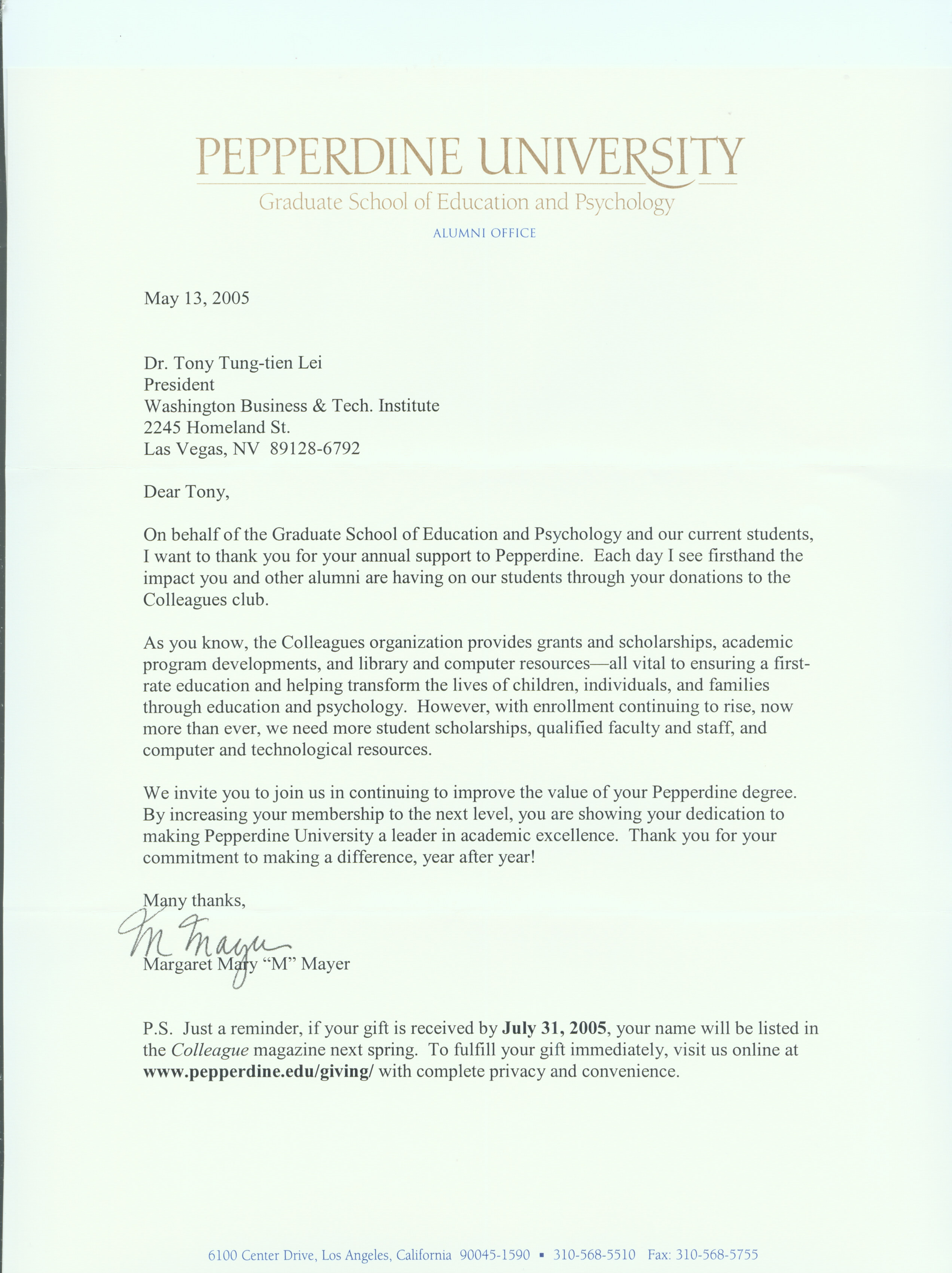 052205 ***** The following letter is from Ms. Margaret Mary "M" Mayer, Director of Alumni Office of the Graduate School of Psychology and Psychology of Pepperdine Univrsity, to President Dr. Tony Tung-tien Lei of Washington Business and Technology Institute (WBTI). Dr. Tony Lei received Doctor of Education (Ed. D.) degree in Institutional Management from Pepperdine University in 1990: |