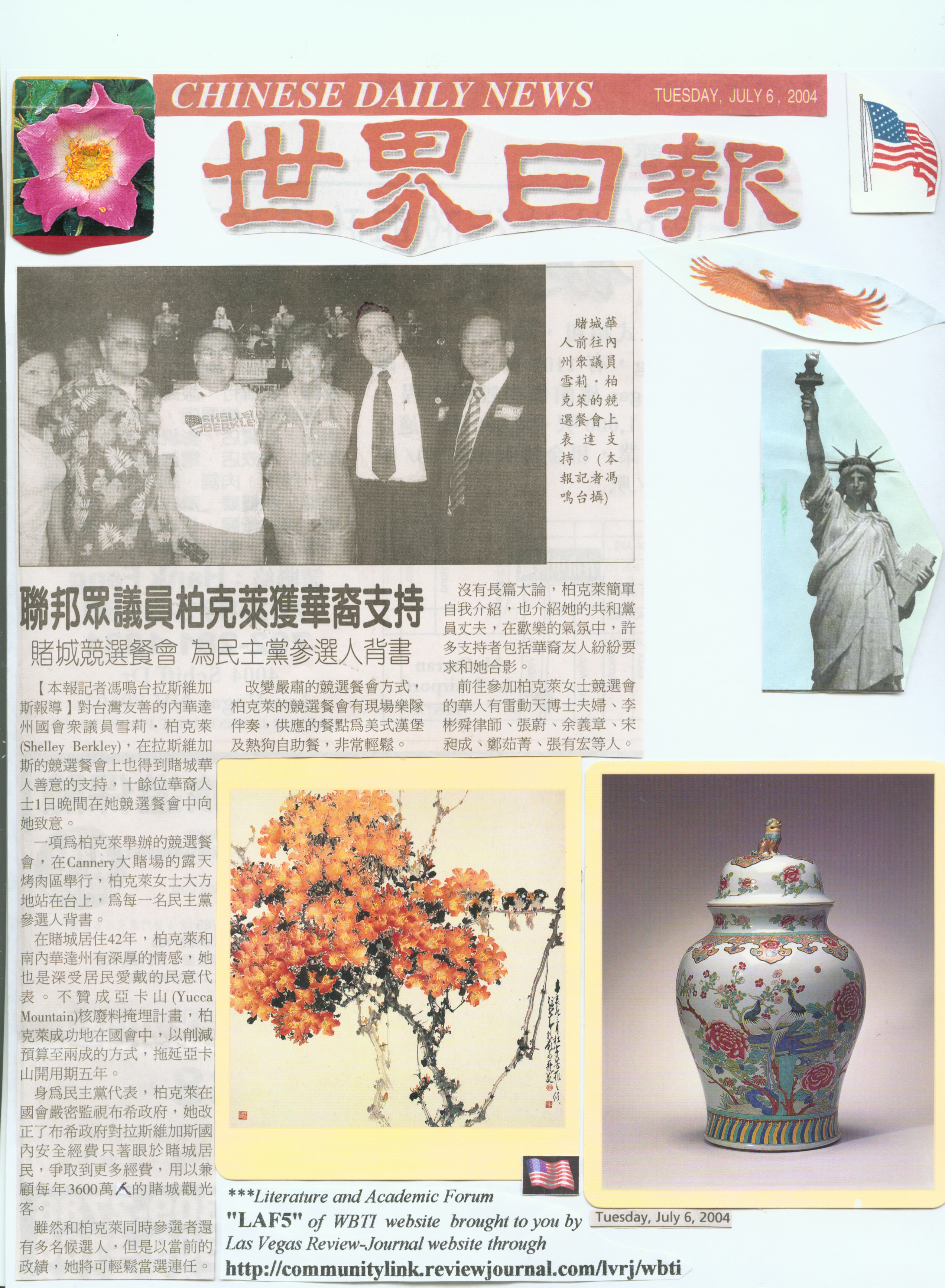 U. S. Congresswoman Shelley Berkley pointed out that "This election is the most important election in my lifetime, for this nation." By ERIN NEFF and GSBPA of WBTI*1"Tony!" welcomed by Shelley Berkly heartily. Leading the largest Asian American group to the kick-off party, Dr. Tony Lei, President of Washington Business and Technology Institute (WBTI), hugged with Shelley Berkley pleasantly by wishing her a good luck. The Party attracted many hundred of her relatives and friends to a Club in North Las Vegas on Thurday, July 1, 2004.*2 Dina Titus introduced and spoke for Shelley Berkley to all the audience including lots of candidates in the election on 2004 for public service. Dina is a Senator and the Minority Leader of Nevada Senate. It is our pleasure to post the following concise report concerned the Party by the largest newspaper of Nevada ---Las Vegas Review-Journal*3: Monday, July 05, 2004 Copyright @ Las Vegas Review-Journal (This is the concise one.) POLITICAL NOTEBOOK: Berkley basks in kickoff to first easy campaign Congresswoman throws party in North Las Vegas By ERIN NEFF REVIEW-JOURNAL .... On Thursday evening at the Cannery, Berkley showed just how different this year will be thanks to the GOP, which didn't come up with a standard bearer, or even a minor opponent.*4 With no need for aggressive fund raising or advertising, Berkley could throw a party. And her campaign kickoff event appeared at times like a wedding, at times a rally and most of all like a good-old summer barbecue in a big ethnic neighborhood back East, complete with booze, huge burgers and the band Doo-Wop.com, playing a steady dose of '50s and '60s music. The bride at this affair was thrilled to take the stage without any notable objections from across the aisle. She faces two grass-roots speed bumps in the Democratic primary before a general election bid against the winner of a three-person GOP primary. Thursday was her coming out party, and she made it clear to the candidates she allowed microphone time, who was being feted. .... Berkley, dressed in a shiny red pantsuit with matching shoes, told the crowd of hundreds they could "party all night." "I wanted to do something different this year," she said from the stage of the North Las Vegas casino's The Club, which had opened its back door to the festivities outdoors. The rally part came in her very brief stump speech, in which she said: "This election is the most important election in my lifetime, for this nation.*5 ... We are pleased to post the following "About the author" from the feature article entitled "U. S. Congresswoman Shelley Berkley extends to you this invitation to join in her Campaign Kick-off on July 1, 2004" by Shelley Berkley and GSBPA of WBTI: U. S. Congresswoman Shelley Berkley --- a real star for Nevada Congresswoman Shelley Berkley was elected to the U.S. House of Representatives in November, 1998. Shelley represents constituents living in the First Congressional District of Nevada, including residents of Las Vegas, North Las Vegas, and unincorporated areas in Clark County. The District annually records the largest population increase in the nation. U. S. Congresswoman Shelley Berkley has A Lifetime of Commitment to Nevada. She has lived in Las Vegas for over four decades. Shelley has a deep sense of commitment to give back to the community that opened the doors of opportunity for her. She also has never forgotten that her family headed west seeking a better life, and found it in Las Vegas. She completed junior high and high school in Las Vegas, then went on to become the first member of her family to attend college when she enrolled in UNLV. Elected Student Body President, 1971-1972, she graduated with honors and a B.A. in Political Science from UNLV in 1972. After earning her law degree at the University of San Diego School of Law in 1976, she returned to Las Vegas to begin her career. U. S. Congresswoman Shelley Berkley has successfully sought appointments that enable her to meet the needs of Southern Nevada, since she swore in as a Member of Congress on January 6, 1999. Shelley is a former Vice Chair of the Nevada University and Community College System Board of Regents. Appointed to the Board in 1990 by the Governor, she was then twice elected as a Regent by Las Vegas-area voters. She completed her second term on the Board in 1998. Throughout her tenure, Shelley worked to keep higher education in Nevada affordable and accessible to all qualified students. This bright lady has devoted her energies to charitable and civic efforts ever since she was a teenager. Her work and ideas have contributed to many of Southern Nevada’s successes. On February 23, 2004, U. S. Congresswoman Shelley Berkley wrote Dr. and Mrs. Tony Lei that,"Thank you for your generous contribution to my re-election campaign. I greatly appreciate your support. Please know that your help makes a significant difference. I look forward to continuing my service in Congress and shall endeavor to serve in the manner that merits your confidence in me."*6 Shelley Berkley is born a leader. Shelley is an educated leader. Shelley is a prctical and bright leader since her college life. She received her juris doctorate degree from San Deigo Law School. She was the former Regent of University and Colleges of Nevada. She has been Executive Advisor for Washington Business and Technology Institute (WBTI) since 1996. Her successful leadership both good in work performance and human relations has won all her assistants' and followers' full and sincere respects. In order to celebrate Shelley Berkley's winning as U. S. Congresswoman, elected as a member of the International Relations Committee (IRC) of the Congress, and Dr. Tony Lei as her Senior Advisor; Washington Business and Technology Institute (WBTI) and Chinese American Academic Association of Nevada (CAAAN) established the "Literature and Academic Forum" ("LAF") in 1999. It is brought to you now by Las Vegas Review-Journal thro
