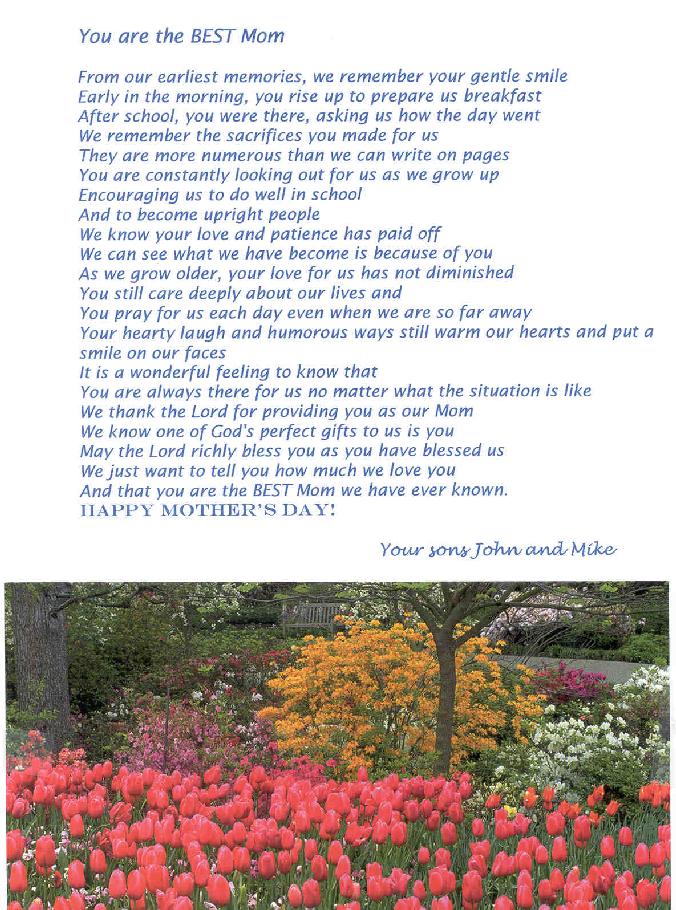 Blessings for our Great DadThis is a special blessings message to our great Dad, Whom we thank from our hearts on this Father's Day. Your hard work through the years to provide for our family Will always be remembered and appreciated; Your leadership in the family provided stability and unity, You taught us the value of hardwork and education, You inspired us to pursue the highest goals, We remember the times of laughter and sharing, You encouraged us when we are discouraged, We always know that you will be there to support us, You succeeded where many have failed because You put our family first. Most of all, we rejoice because we are all in God's family. And this is our prayer... May you be blessed with good health year after year after year, May you be blessed with joy each and every single day, May you be blessed with a fire within to know our Lord Jesus Christ more and more, May you be blessed with prosperity in all your endeavors, May you be blessed with a peace of mind and an unshakable faith, May you be blessed with many testimonies of how God showed Himself to you We love you and we wish you the Best Father's Day ever! Your sons John & Mike | | | |