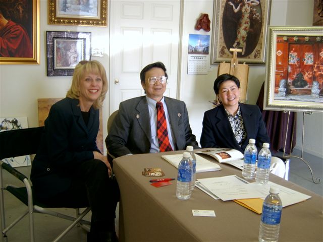 062306-1037 (3) ***** (From left to right) Nevada Assemblywoman Valerie Weber, President Dr. Tony Tung-tien Lei of Washington Business and Technology Institute, and Nevada District Court Judge Cheryl Moss visiting Pengju Li's Art Gallery and School : |